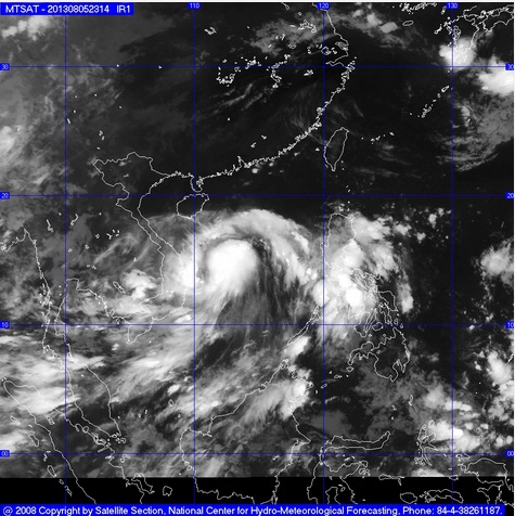 Tối nay (07/8), bão số 6 đã đi vào khu vực các tỉnh nam đồng bằng Bắc Bộ và Thanh Hóa. Hồi 22 giờ, vị trí tâm bão ở vào khoảng 19,9 độ Vĩ Bắc; 105,5 độ Kinh Đông, trên địa phận các tỉnh Thanh Hóa – Ninh Bình. Sức gió mạnh nhất ở vùng gần tâm bão mạnh cấp 8 (tức là từ 62 đến 74 km một giờ), giật cấp 9, cấp 10.