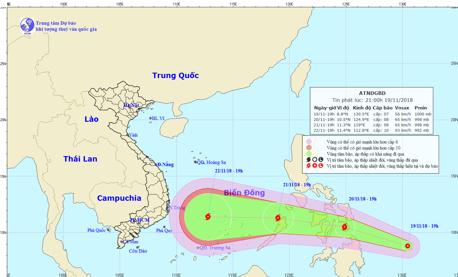 Hồi 19 giờ ngày 21/11, vị trí tâm áp thấp nhiệt đới ở vào khoảng 10,6 độ Vĩ Bắc; 120,5 độ Kinh Đông,cách phía Bắc đảo Pa-la-oan (Phi-líp-pin) khoảng 100km về phía Tây.Sức giómạnh nhất vùng gần tâm áp thấp nhiệt đới mạnh cấp 7(50-60km/giờ),giật cấp9.