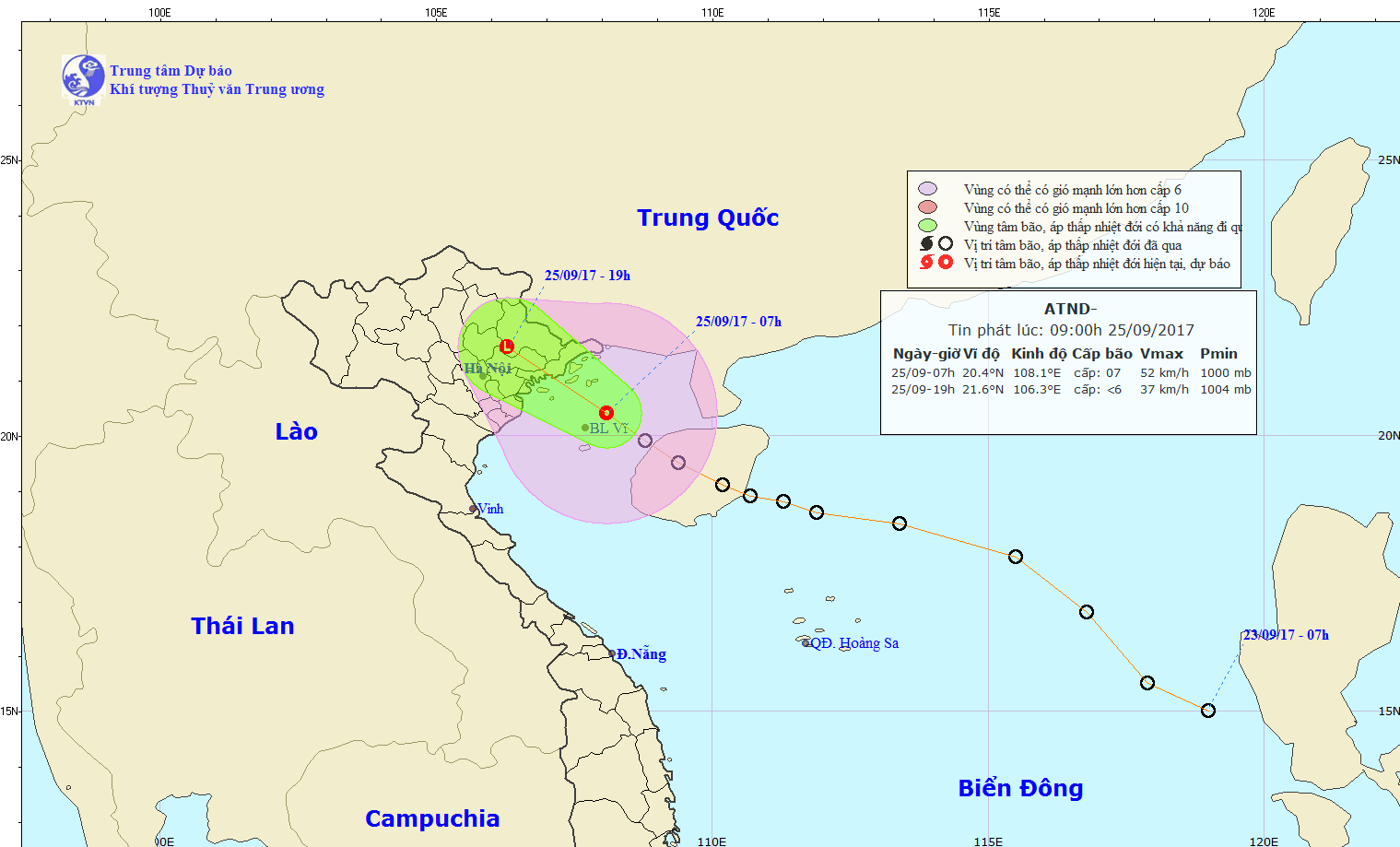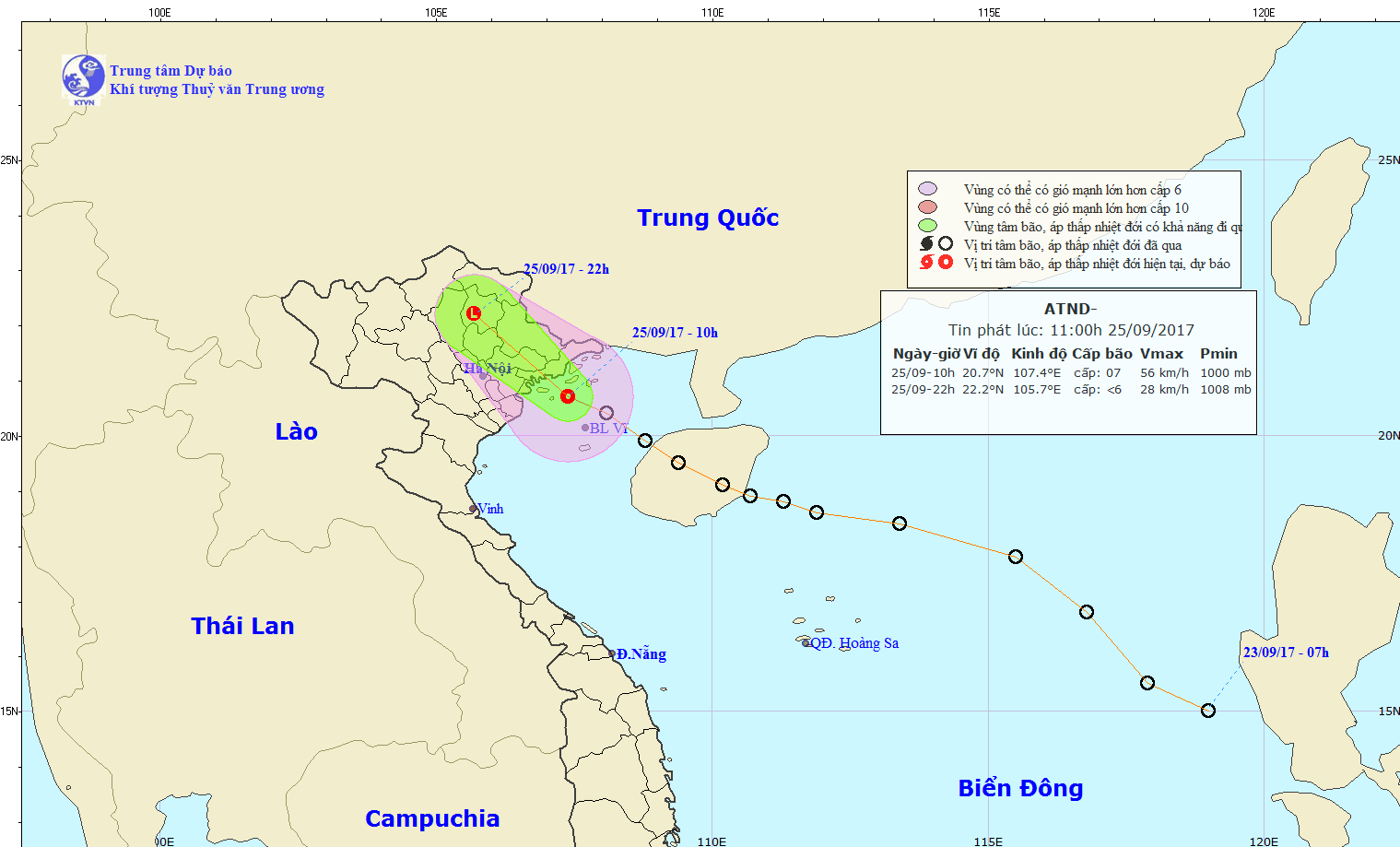 Hồi 10 giờ ngày 25/09, vị trí tâm áp thấp nhiệt đới ở vào khoảng 20,7 độ Vĩ Bắc; 107,4 độ Kinh Đông, ngay trên vùng biển Quảng Ninh-Hải Phòng. Sức gió mạnh nhất ở vùng gần tâm áp thấp nhiệt đới mạnh cấp 6-7 (40-60km/giờ), giật cấp 9.