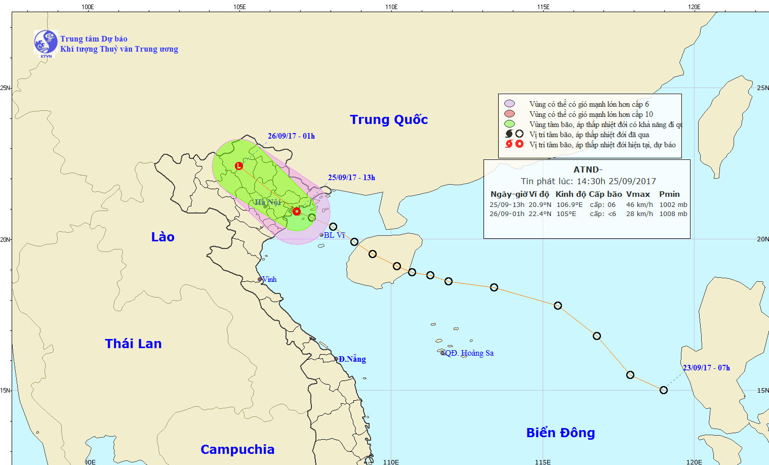 Hồi 13 giờ ngày 25/09, vị trí tâm áp thấp nhiệt đới ở vào khoảng 20,9 độ Vĩ Bắc; 106,9 độ Kinh Đông, trên bờ biển Quảng Ninh-Hải Phòng. Sức gió mạnh nhất ở gần tâm áp thấp nhiệt đới mạnh cấp 6 (40-50km/giờ), giật cấp 7.