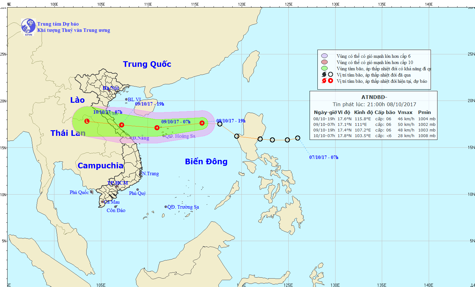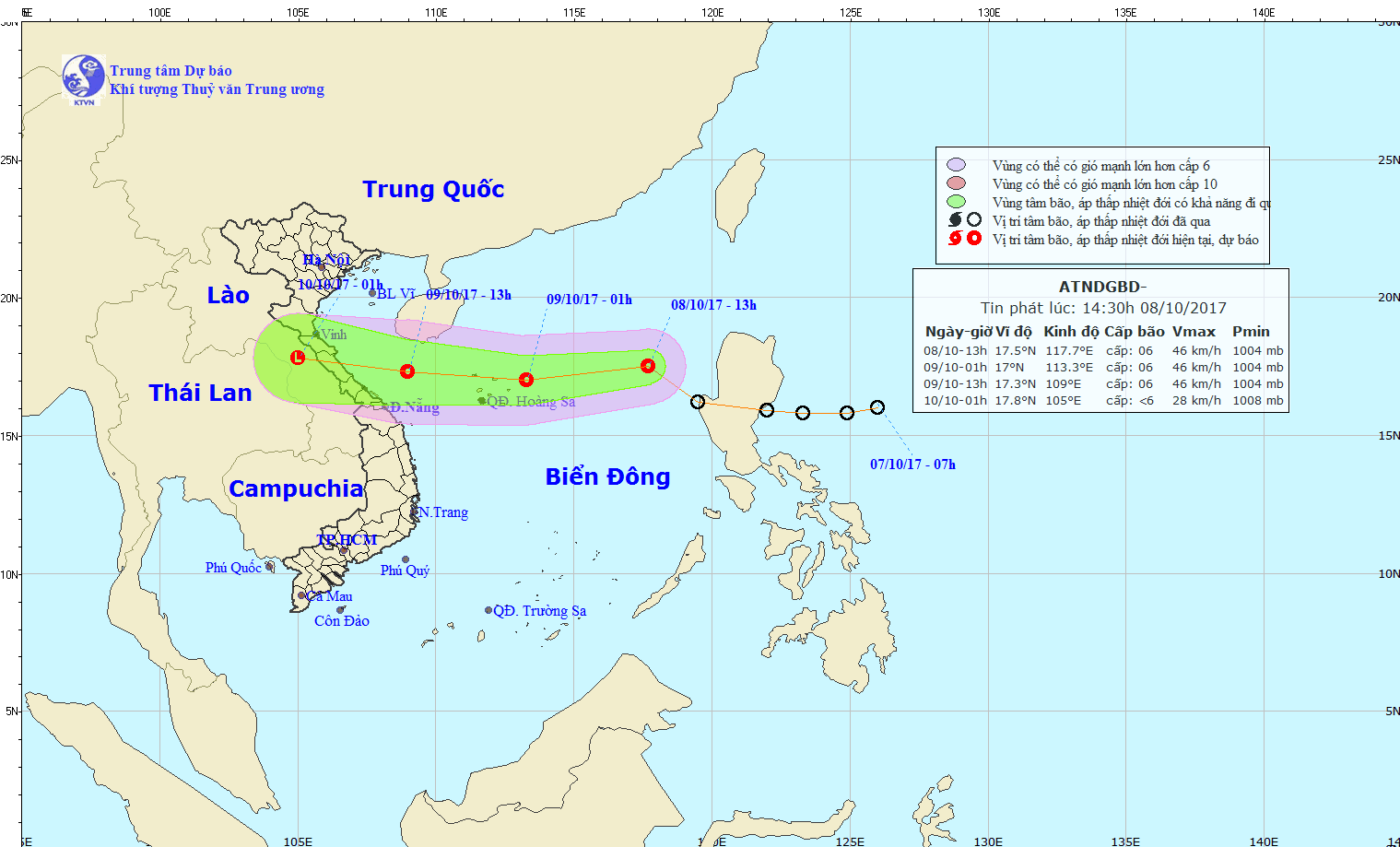 Hồi 19 giờ ngày 08/10, vị trí tâm áp thấp nhiệt đới ở vào khoảng 17,6 độ Vĩ Bắc; 115,8 độ Kinh Đông, cách quần đảo Hoàng Sa khoảng 360km về phía Đông Đông Bắc. Sức gió mạnh nhất ở vùng gần tâm áp thấp nhiệt đới mạnh cấp 6 (40-50km/giờ), giật cấp 8.