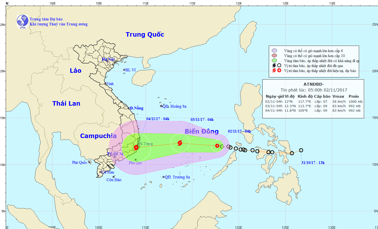Dự báo trong 24 giờ tới, áp thấp nhiệt đới di chuyển chủ yếu theo hướng Tây, mỗi giờ đi được khoảng 20km và có khả năng mạnh lên thành bão. Đến 04 giờ ngày 03/11, vị trí tâm bão ở vào khoảng 12,3 độ Vĩ Bắc; 113,7 độ Kinh Đông, trên khu vực phía Bắc quần đảo Trường Sa. Sức gió mạnh nhất ở vùng gần tâm bão mạnh cấp 8-9 (60-90km/giờ), giật cấp 11.
