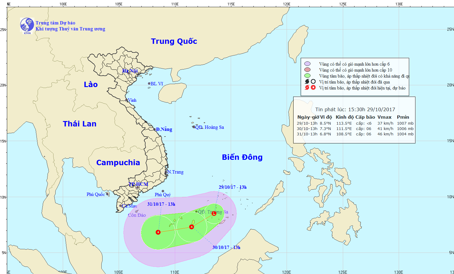 Hồi 1 giờ ngày 29/10, vùng áp thấp có vị trí ở vào khoảng 6.9-8,9 độ Vĩ Bắc; 111,8-113,8 độ Kinh Đông, ngay trên vùng biển quần đảo Trường Sa.