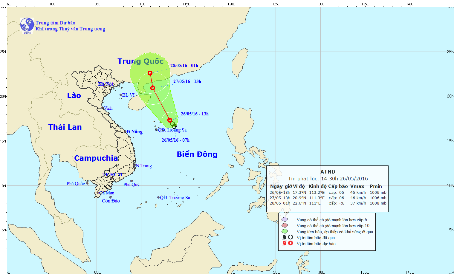 Hồi 14 giờ chiều nay (26/5), vị trí tâm áp thấp nhiệt đới ở vào khoảng 17,3 độ vĩ Bắc; 113,2 độ kinh Đông, trên khu vực phía Đông Bắc quần đảo Hoàng Sa. Sức gió mạnh nhất ở vùng gần tâm áp thấp nhiệt đới mạnh cấp 6 (40-50km/giờ), giật cấp 7-8.