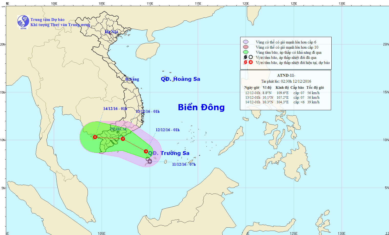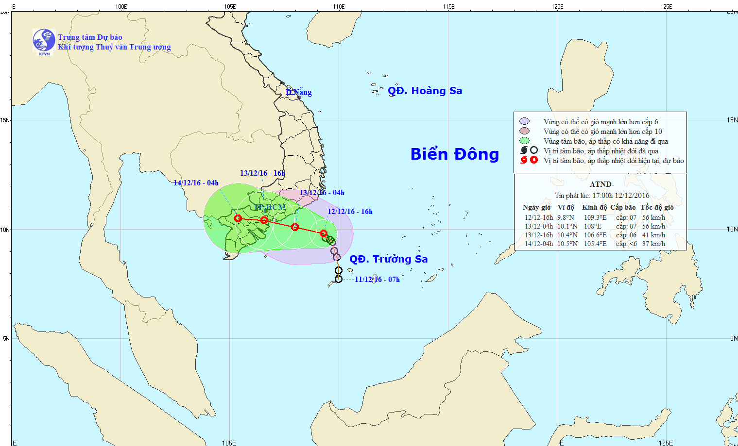 Hồi 16 giờ (ngày 12/12), vị trí tâm áp thấp nhiệt đới ở vào khoảng 9,8 độ Vĩ Bắc; 109,3 độ Kinh Đông, cách bờ biển các tỉnh Bình Thuận – Bến Tre khoảng 230km về phía Đông Đông Nam. Sức gió mạnh nhất ở vùng gần tâm áp thấp nhiệt đới mạnh cấp 7 (50-60km/h), giật cấp 8-9.
