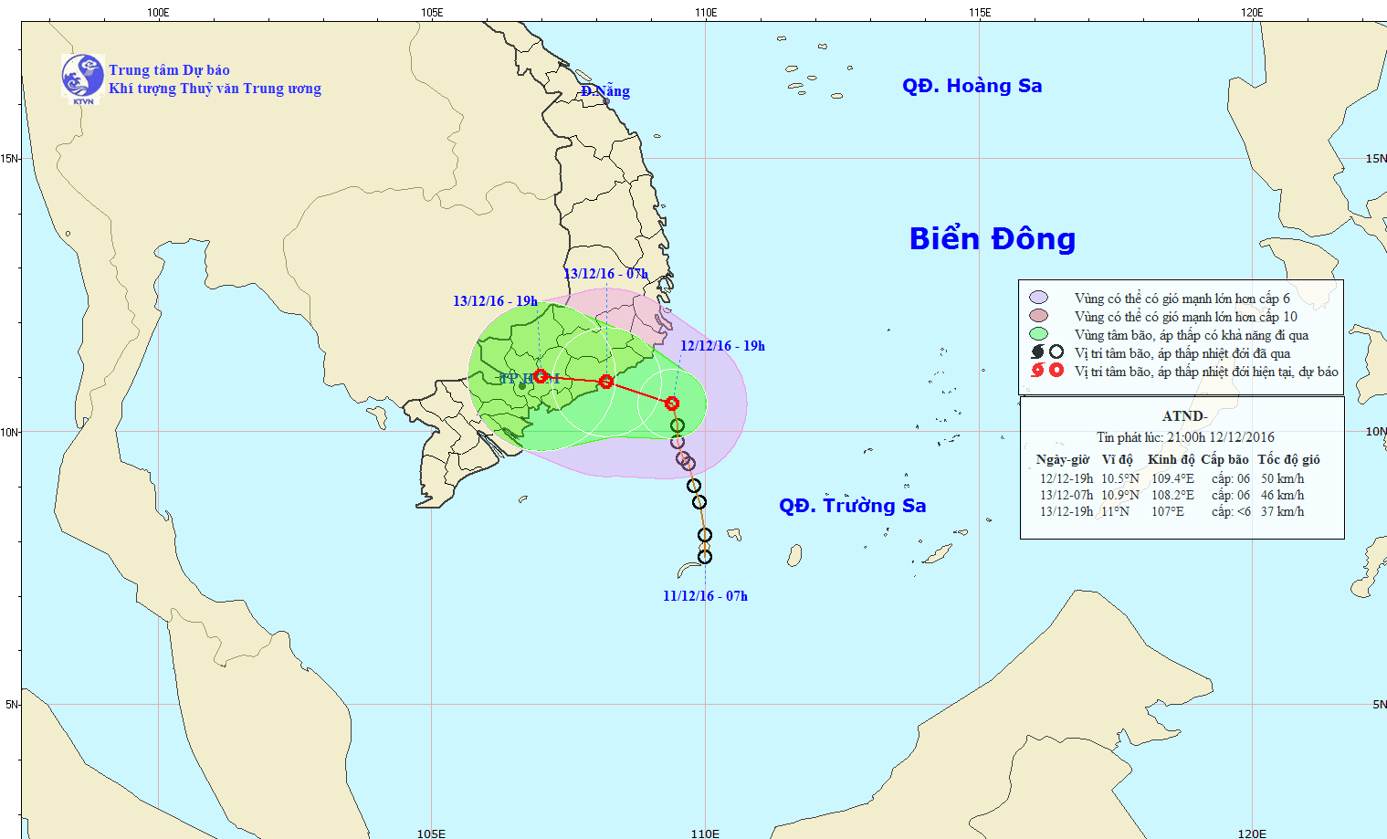 Hồi 19 giờ (ngày 12/12), vị trí tâm áp thấp nhiệt đới ở vào khoảng 10,5 độ Vĩ Bắc; 109,4 độ Kinh Đông, cách bờ biển các tỉnh Ninh Thuận – Bà Rịa Vũng Tàu khoảng 150km về phía Đông Đông Nam. Sức gió mạnh nhất ở vùng gần tâm áp thấp nhiệt đới mạnh cấp 6 (40-50km/h), giật cấp 7-8.