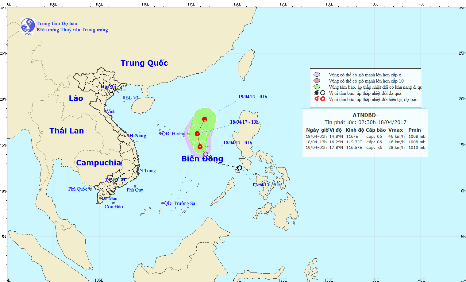 Hồi 01 giờ ngày 18/04, vị trí tâm áp thấp nhiệt đới ở vào khoảng 14,8 độ Vĩ Bắc; 116,0 độ Kinh Đông, cách quần đảo Hoàng Sa khoảng 460km về phía Đông Nam. Sức gió mạnh nhất ở vùng gần tâm áp thấp nhiệt đới mạnh cấp 6 (40-50km/giờ), giật cấp 7-8.