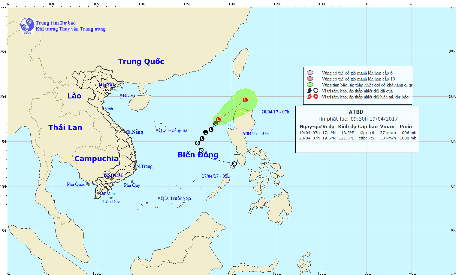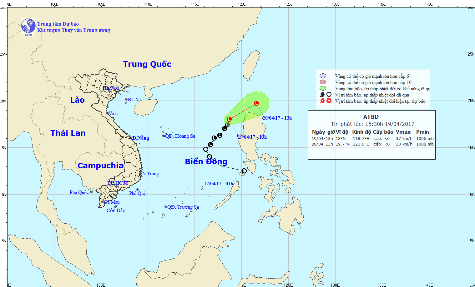 Hồi 07 giờ ngày 19/4, vị trí trung tâm vùng áp thấp ở vào khoảng 17,4 độ Vĩ Bắc; 118,5 độ Kinh Đông, cách đảo Lu-dông (Phi-líp-pin) khoảng 200km về phía Tây. Sức gió mạnh nhất ở trung tâm vùng áp thấp mạnh cấp 5 (dưới 40km/giờ), giật cấp 6-7.