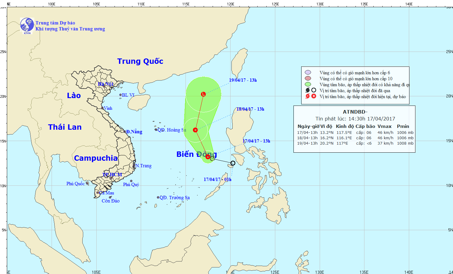 Hồi 13 giờ chiều nay (17/04), vị trí tâm áp thấp nhiệt đới ở vào khoảng 13,2 độ Vĩ Bắc; 117,5 độ Kinh Đông, cách đảo Song Tử Tây (quần đảo Trường Sa) khoảng 410km về phía Đông Bắc. Sức gió mạnh nhất ở vùng gần tâm áp thấp nhiệt đới mạnh cấp 6 (40-50km/giờ), giật cấp 7-8.