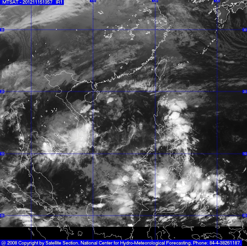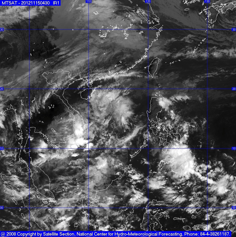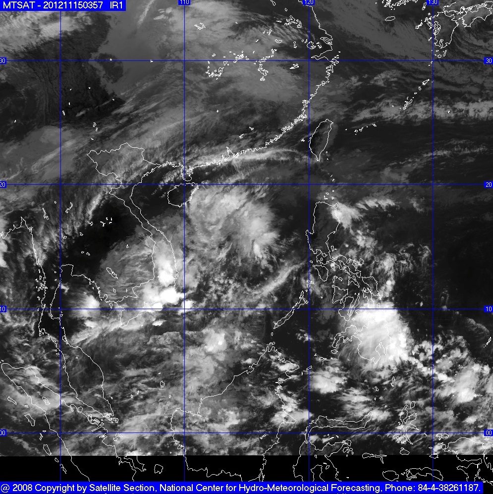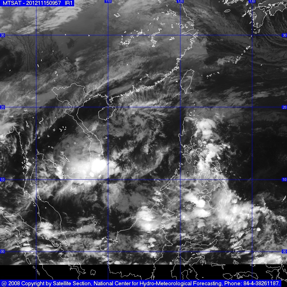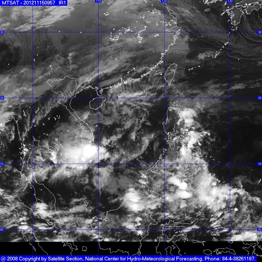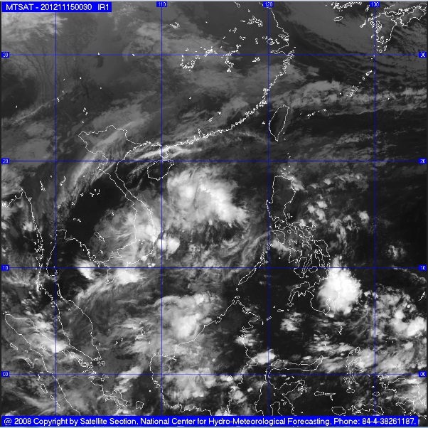 Hồi 19h ngày 15/11, vị trí trung tâm vùng áp thấp ở vào khoảng 9,7 độ Vĩ Bắc; 107,4 độ Kinh Đông.Sức gió mạnh nhất ở trung tâm vùng áp thấp giảm xuống dưới cấp 6 (tức là dưới 39km một giờ).