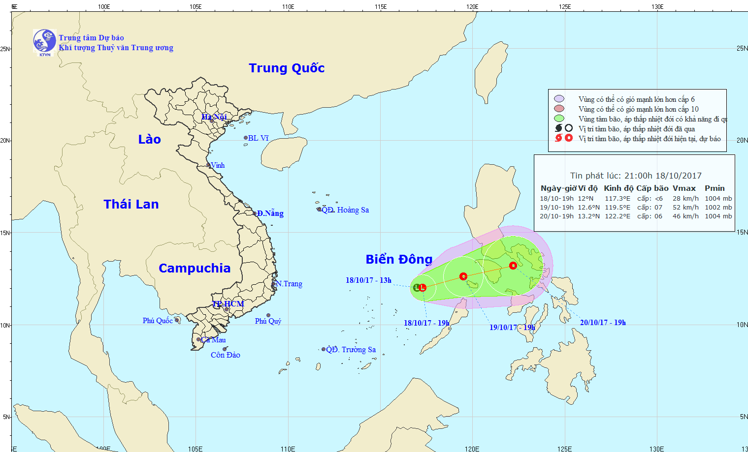 Hồi 19 giờ ngày 19/10, vị trí trung tâm vùng áp thấp ở vào khoảng 11,2-12,2 độ Vĩ Bắc; 117,2-118,2 độ Kinh Đông, cách đảo Song Tử Tây khoảng 370km về phía Đông Đông Bắc.