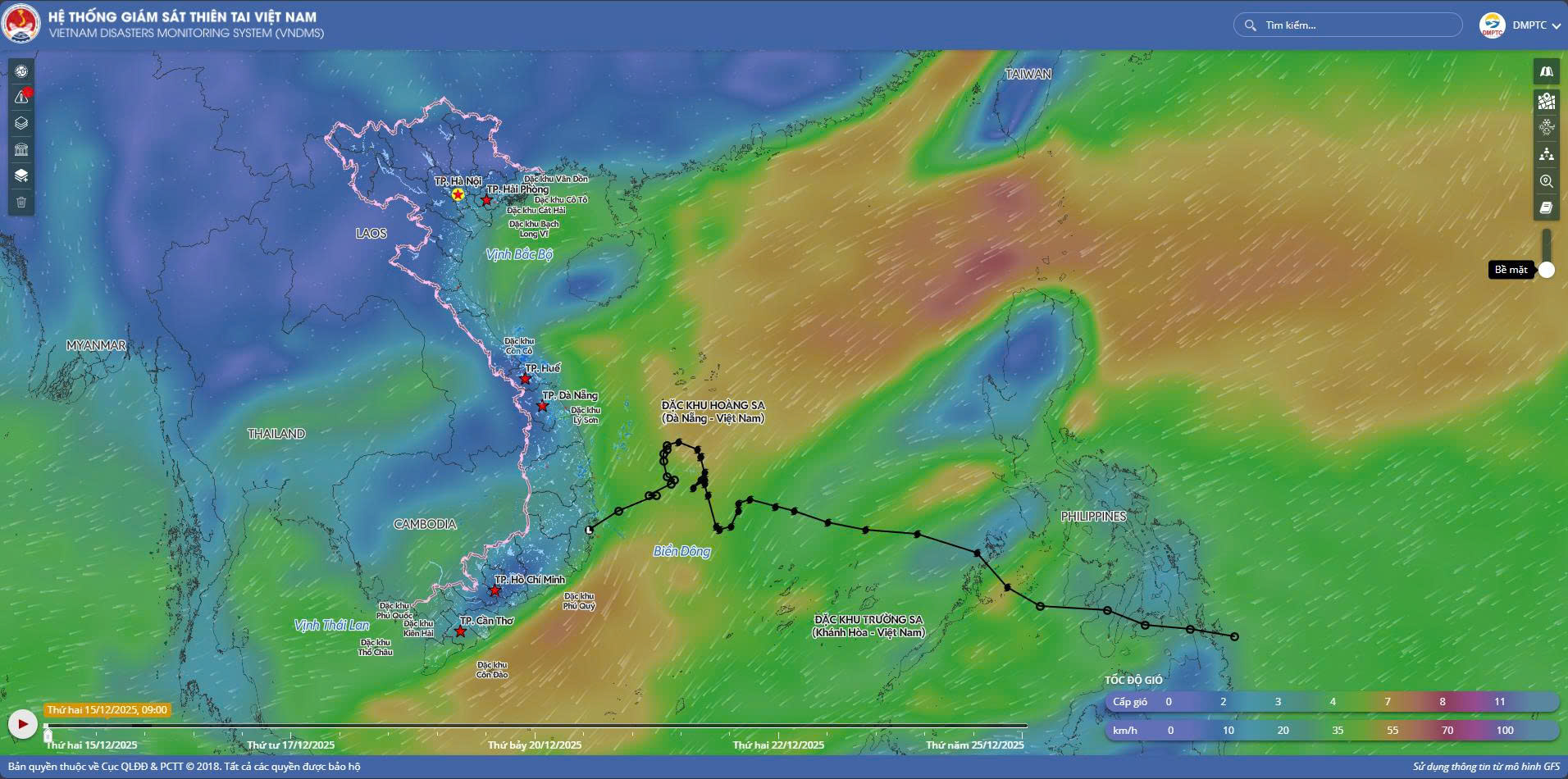 - Hồi 07 giờ ngày 03/12, vị trí tâm áp thấp nhiệt đới ở vào khoảng 13,3 độ Vĩ Bắc; 111,0 độ Kinh Đông, trên vùng biển phía Tây Bắc khu vực Giữa Biển Đông. Sức gió mạnh nhất vùng gần tâm áp thấp nhiệt đới mạnh cấp 6 (39-49km/h), giật cấp 8. Di chuyển chậm theo hướng Nam Tây Nam, tốc độ 5-10km/h.