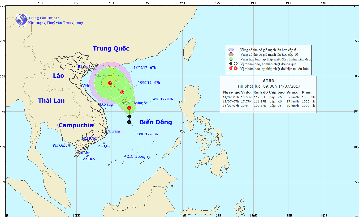 Hồi 01 giờ ngày 14/07, vị trí trung tâm vùng áp thấp ở vào khoảng 14,0-15,0 độ Vĩ Bắc; 112,0-113,0 độ Kinh Đông, cách quần đảo Hoàng Sa khoảng 270km về phía Nam Đông Nam.