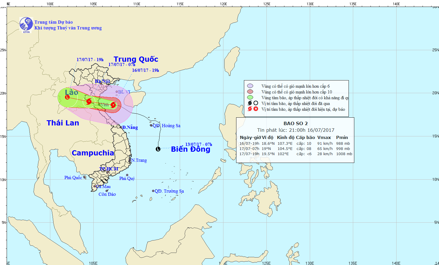 Hồi 20 giờ ngày 16/07, vị trí tâm bão ở vào khoảng 18,6 độ Vĩ Bắc; 107,2 độ Kinh Đông, cách bờ biển các tỉnh Thanh Hóa-Hà Tĩnh khoảng 160km về phía Đông Đông Nam. Sức gió mạnh nhất ở vùng gần tâm bão mạnh cấp 9-10 (75-100km/giờ), giật cấp 11-12.