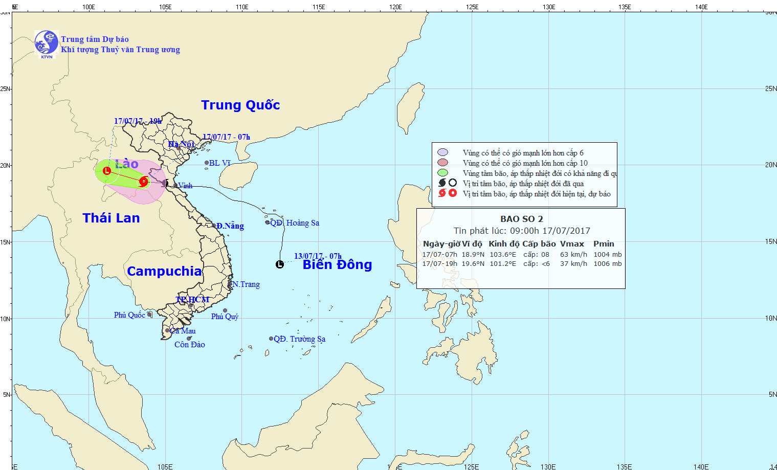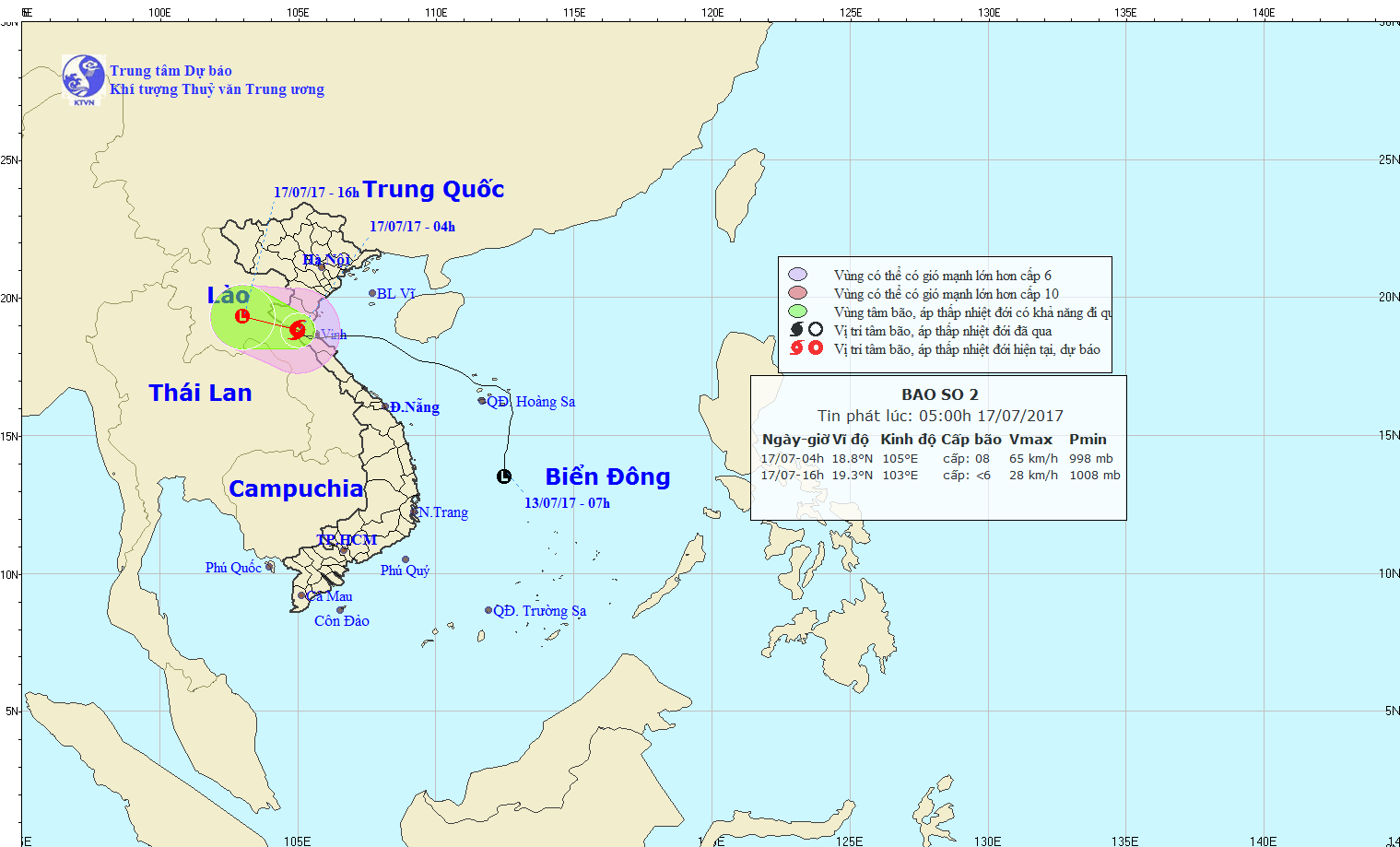 Sáng ngày (17/07) bão số 2 đã vượt qua khu vực biên giới Việt-Lào và đi sang khu vực Trung Lào.