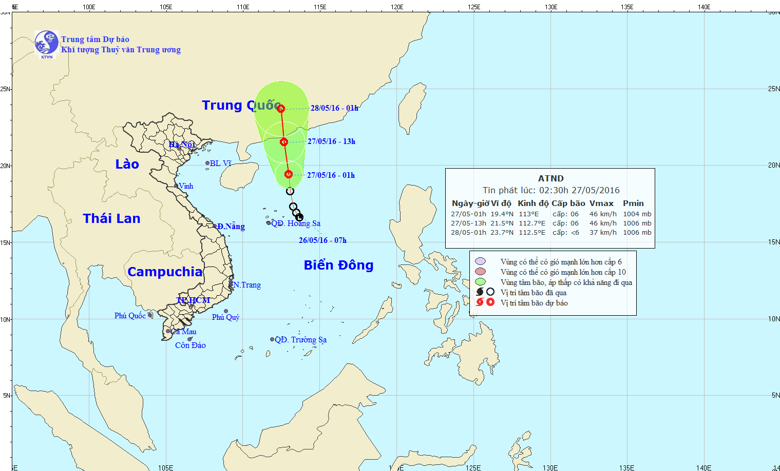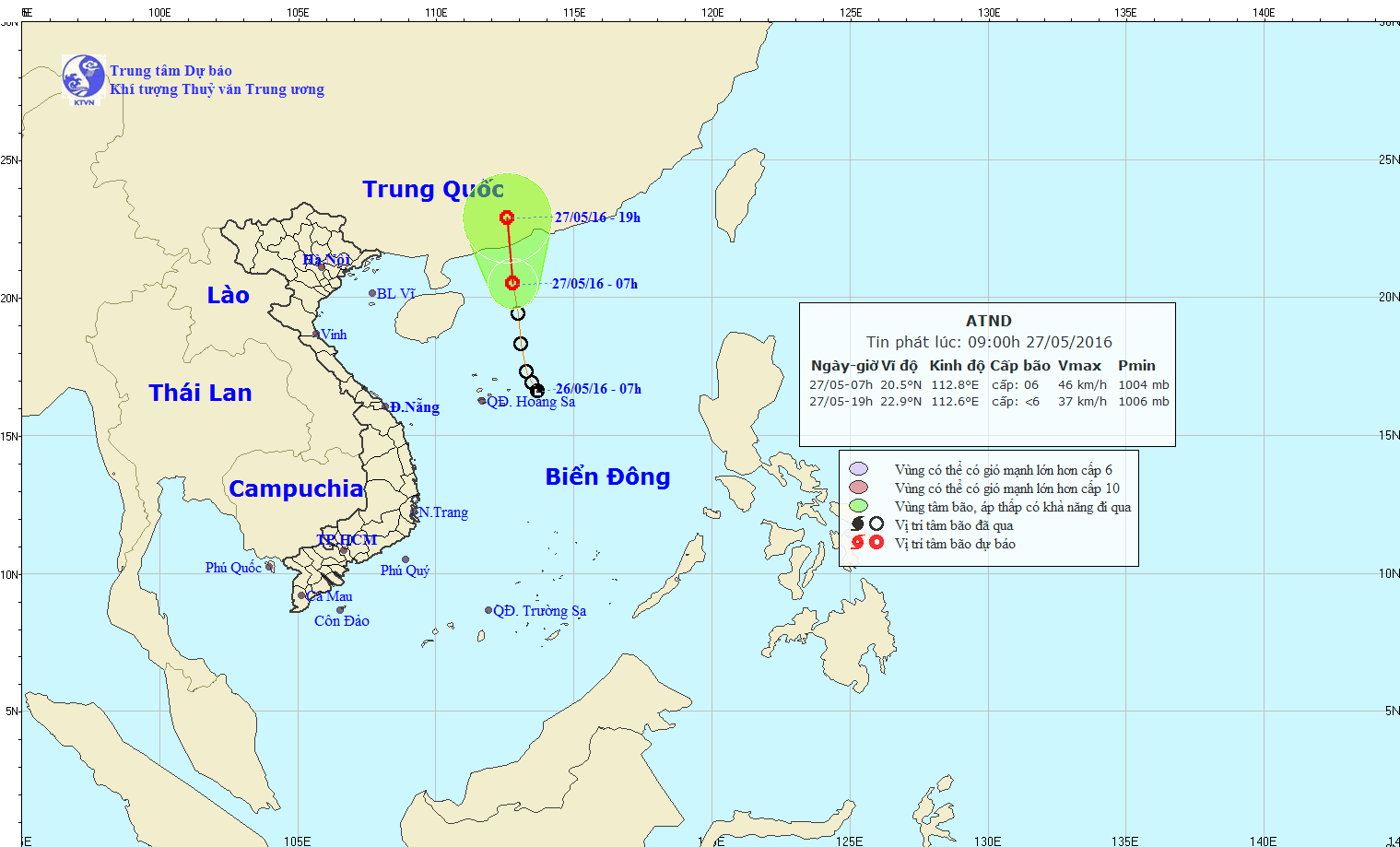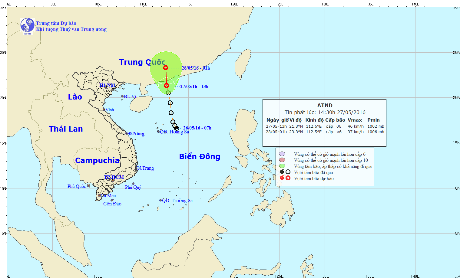 Hồi 14 giờ ngày 27/5, vị trí tâm áp thấp nhiệt đới ở vào khoảng 21,3 độ vĩ Bắc; 112,6 độ kinh Đông, trên vùng biển phía Tây Nam tỉnh Quảng Đông (Trung Quốc). Sức gió mạnh nhất ở vùng gần tâm áp thấp nhiệt đới mạnh cấp 6 (40-50km/giờ), giật cấp 7-8.
