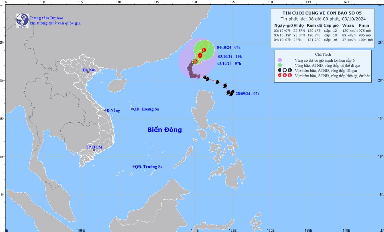 - At 7:00 a.m. on October 3, the center of the storm was at about 22.5 degrees North latitude; 120.1 degrees East longitude, in the sea southwest of Taiwan Island (China). The strongest wind near the center of the storm was level 12 (118-133km/h), gusting to level 15; moving slowly in the northeast direction, speed 5-10km/h.