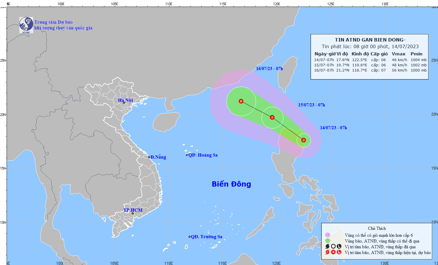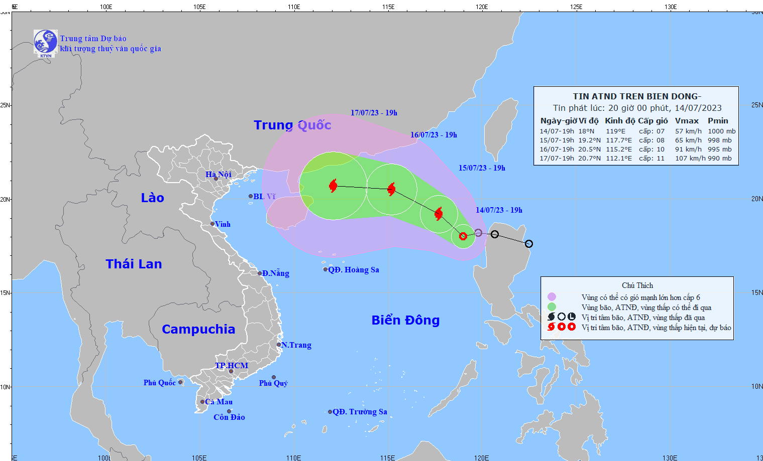 - The Standing Office of the National Steering Committee on Disaster Prevention issued Document No. 262/VPTT on July 13; Dispatch No. 03/CD-VPTT dated July 14 sent to coastal provinces from Quang Ninh to Phu Yen requesting to proactively respond to tropical depression near the East Sea.