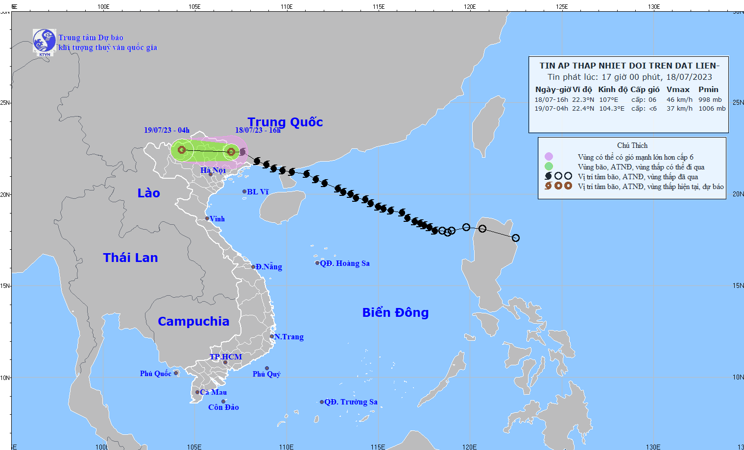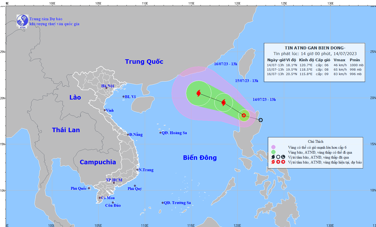- On the afternoon of July 14, a tropical depression passed north of Lu-Dong island (Philippines) and entered the East Sea. At 4 p.m., the location of the tropical depression's center was at about 18.2 degrees north latitude; 119.8 degrees East longitude, on the eastern seaboard of the North East Sea. The strongest wind in the area near the center of the tropical depression is strong at level 6-7 (39-61km/h), level 9 shock.