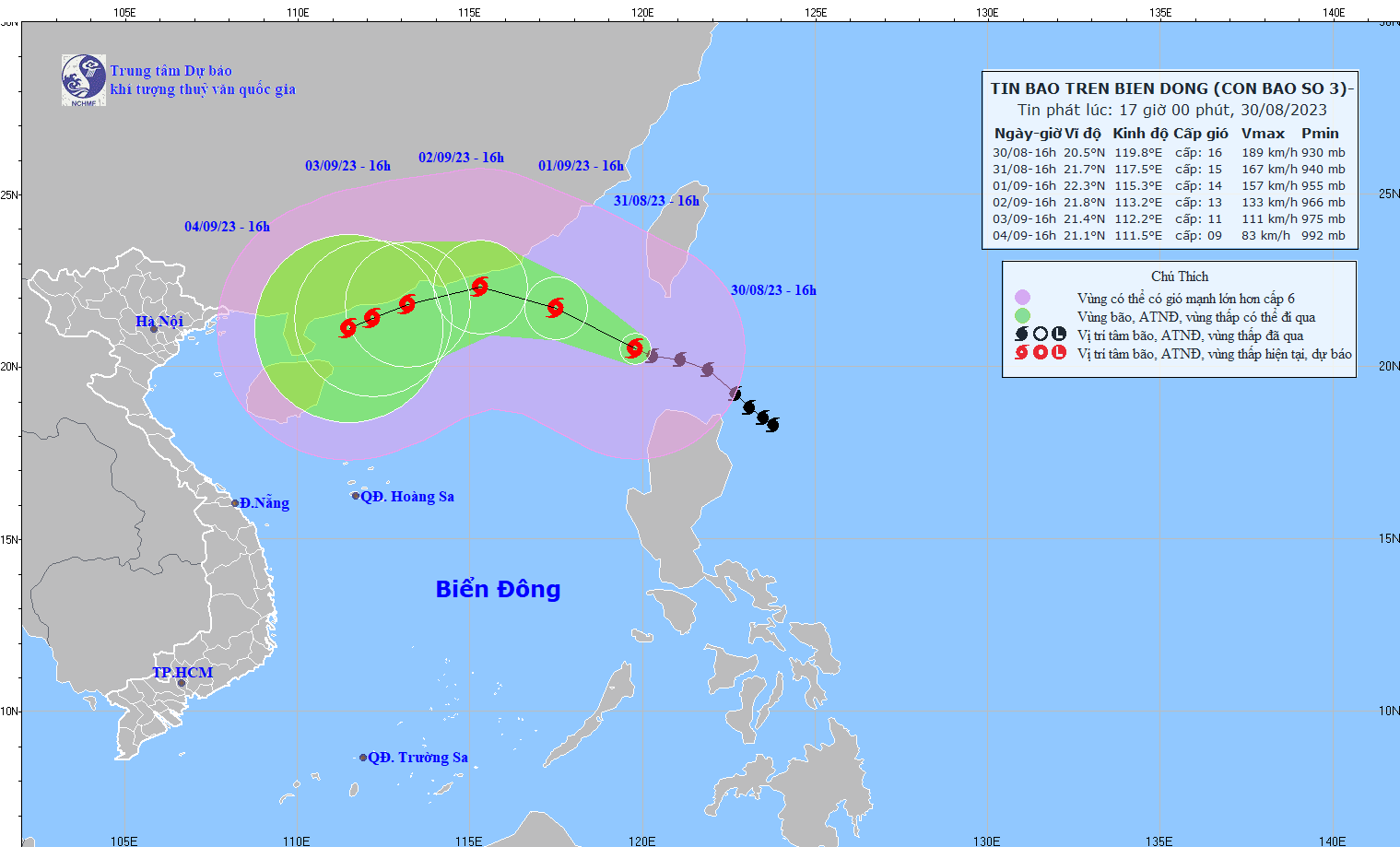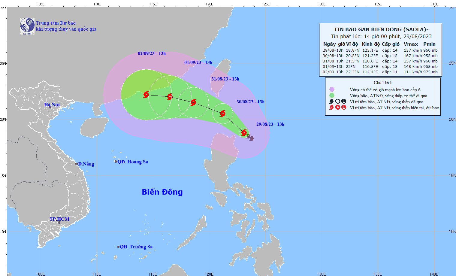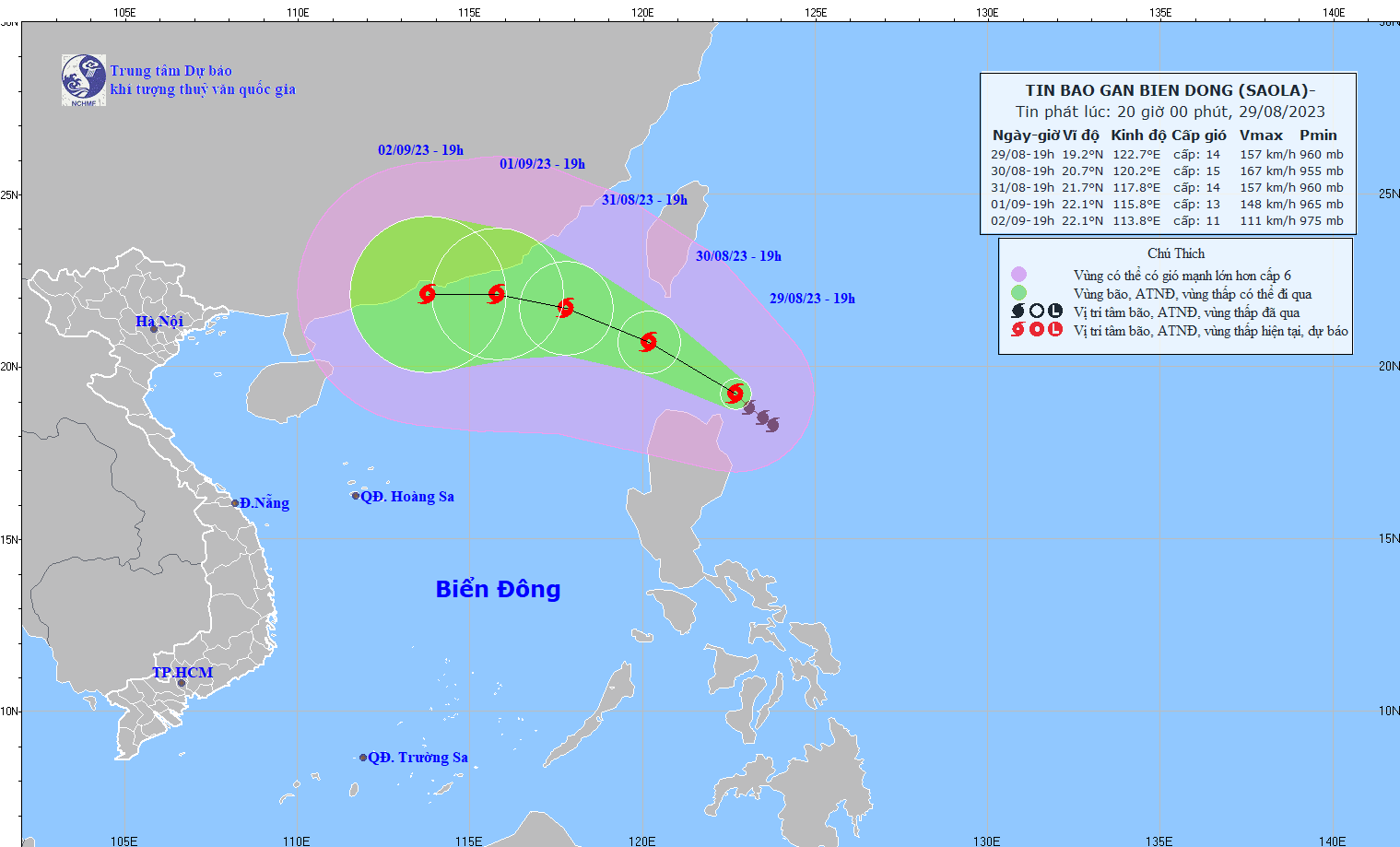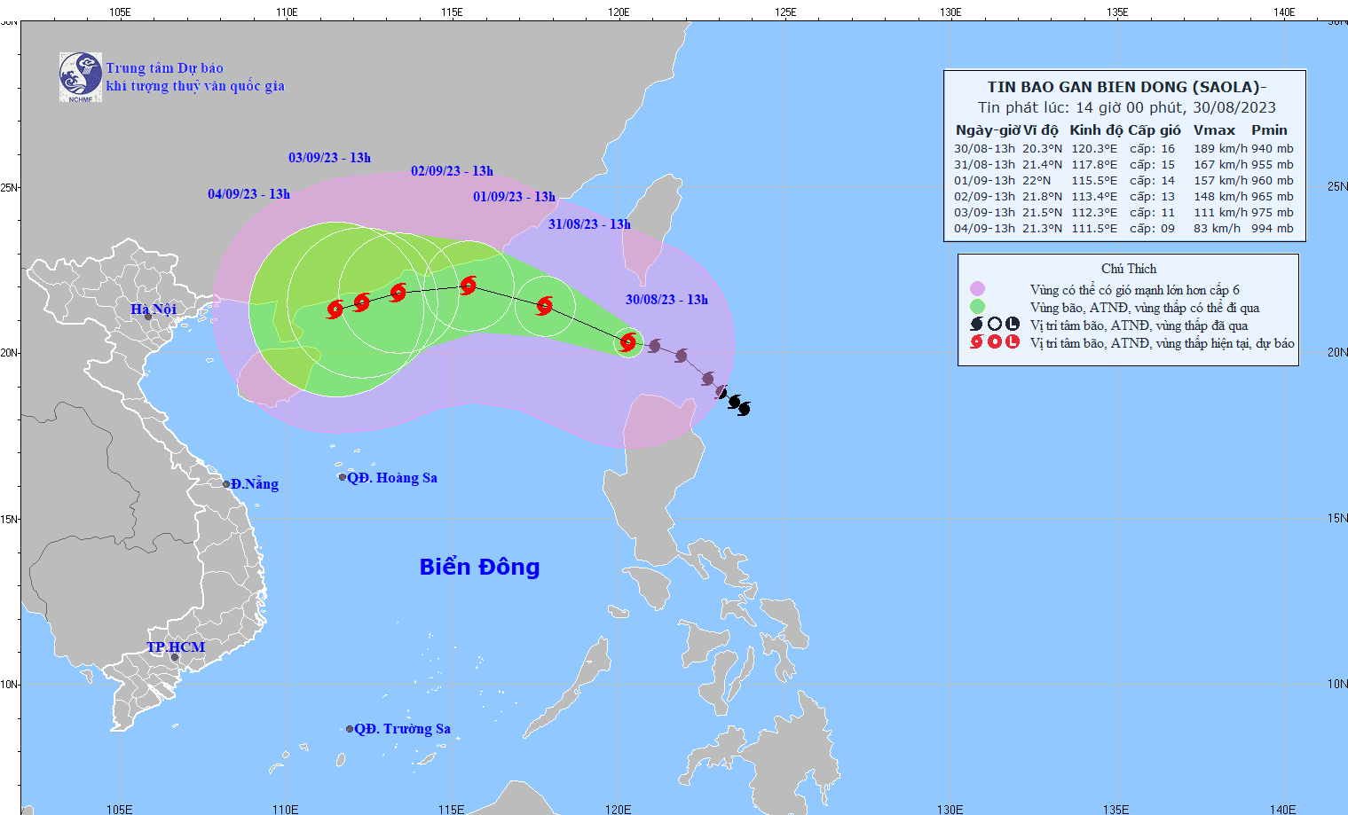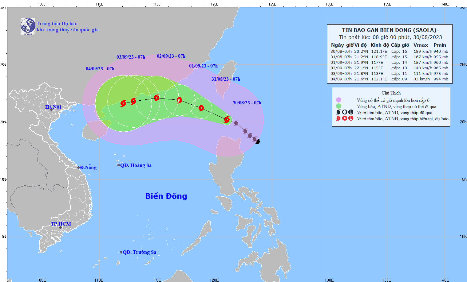 - On the afternoon of August 30, storm SAOLA entered the northeast sea of the North East Sea, becoming storm number 3 in 2023. At 4:00 p.m., the storm's center was at about 20.5 degrees North latitude. ; 119.8 degrees East Longitude, in the northeast sea of the North East Sea region. The strongest wind near the center of the storm is level 15-16 (167-201km/h), gusting above level 17, moving in the West-Northwest direction, speed about 15km/h.