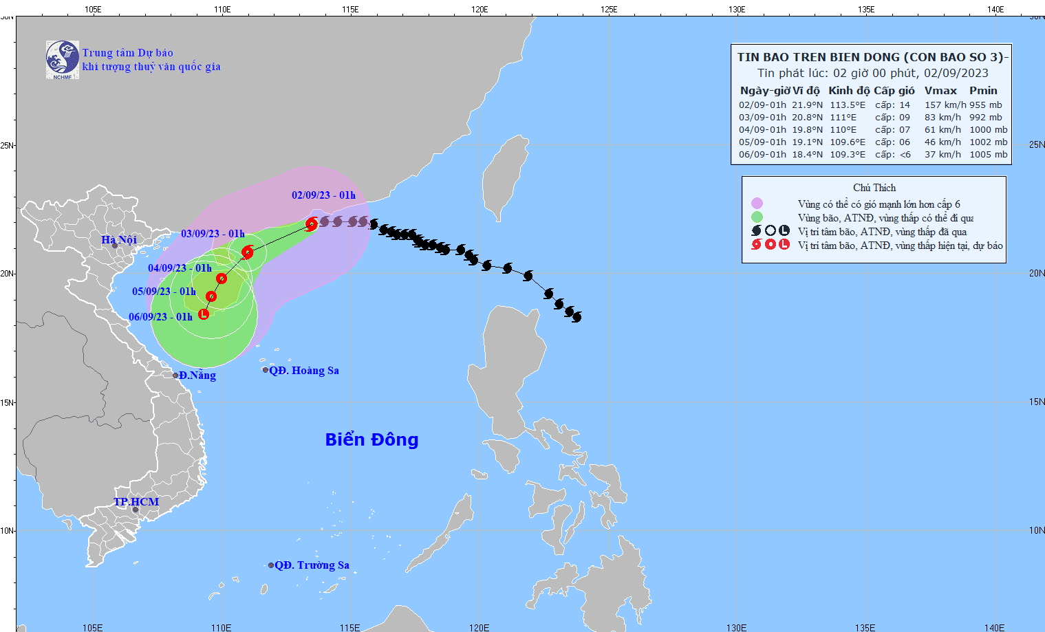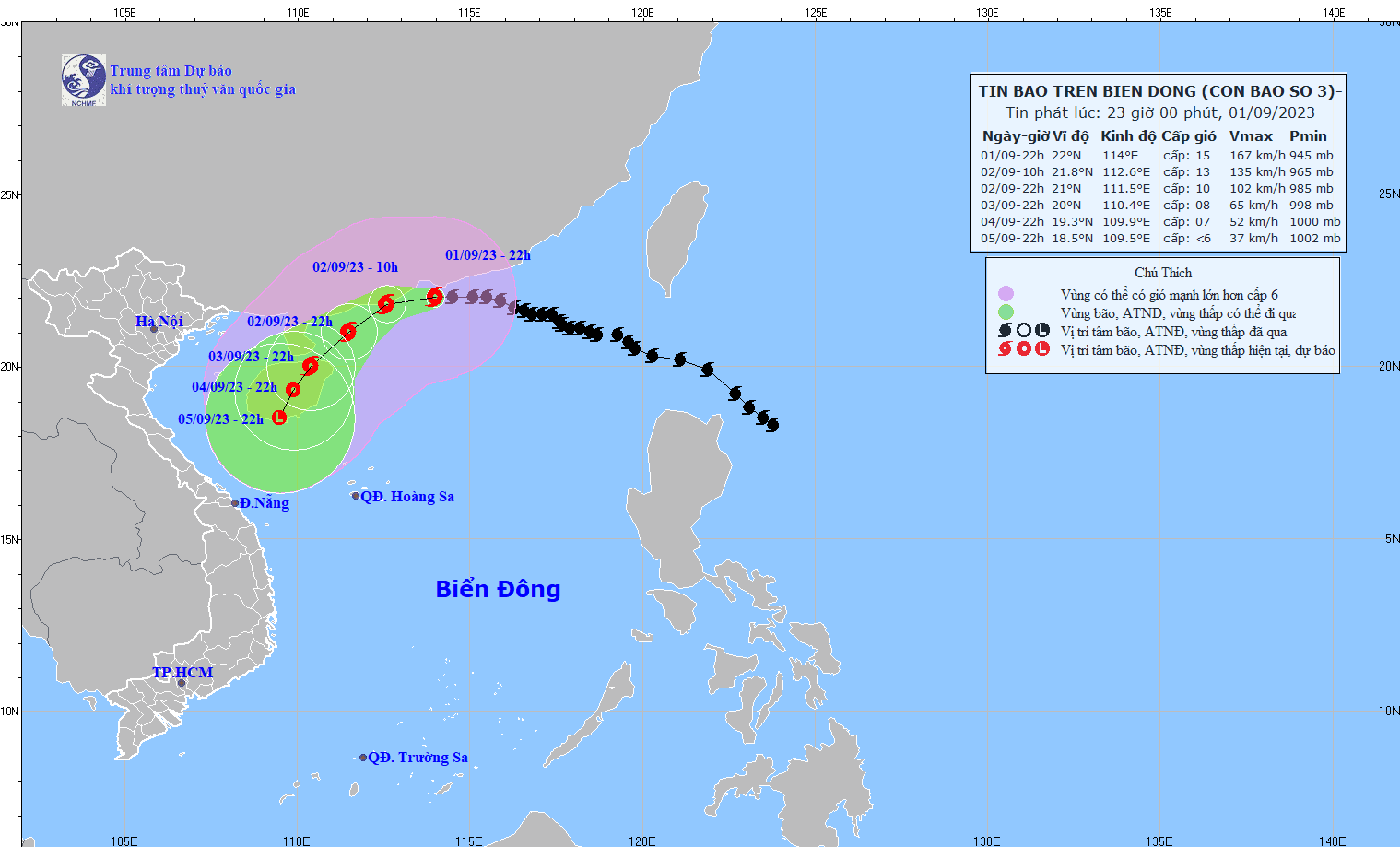 - At 7:00 p.m. on September 1, the storm's center was at about 22.0 degrees North latitude; 114.5 degrees East Longitude, in the waters south of Hong Kong (China). The strongest wind near the center of the storm is level 14-15 (150-183km/h), gusting above level 17, moving in the west, speed about 15 km/h.