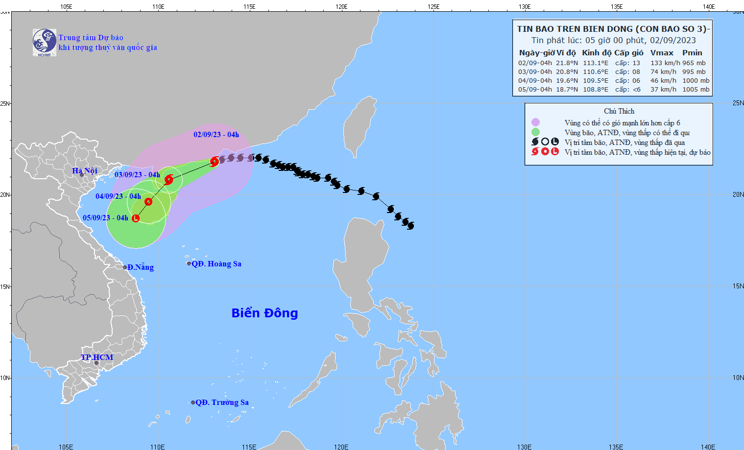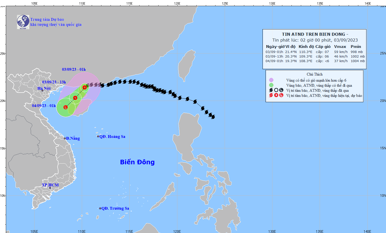 - At 4:00 a.m. on September 2, the storm's center was at about 21.8 degrees North latitude; 113.1 degrees East Longitude, in the southwest sea of Guangdong province (China). The strongest wind near the center of the storm is level 12-13 (118-149km/h), with gusts of level 15, moving in the West-Southwest direction, with a speed of about 15 km/h.