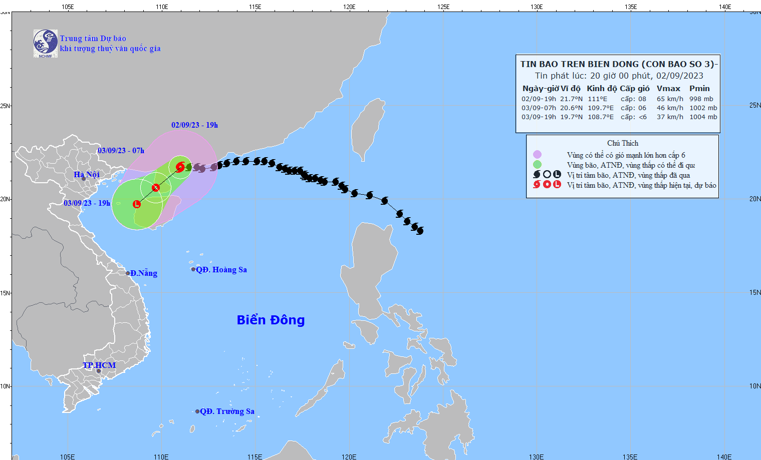 - On the afternoon of September 3, the tropical depression (weakened from storm No. 3) weakened into a low pressure area on the western coast of Leizhou peninsula (China). At 13 o'clock, the position of the low pressure area is about 20.9 degrees North latitude; 109.6 degrees East Longitude. The strongest wind is in the center of the low pressure area below level 6 (under 39km/h).