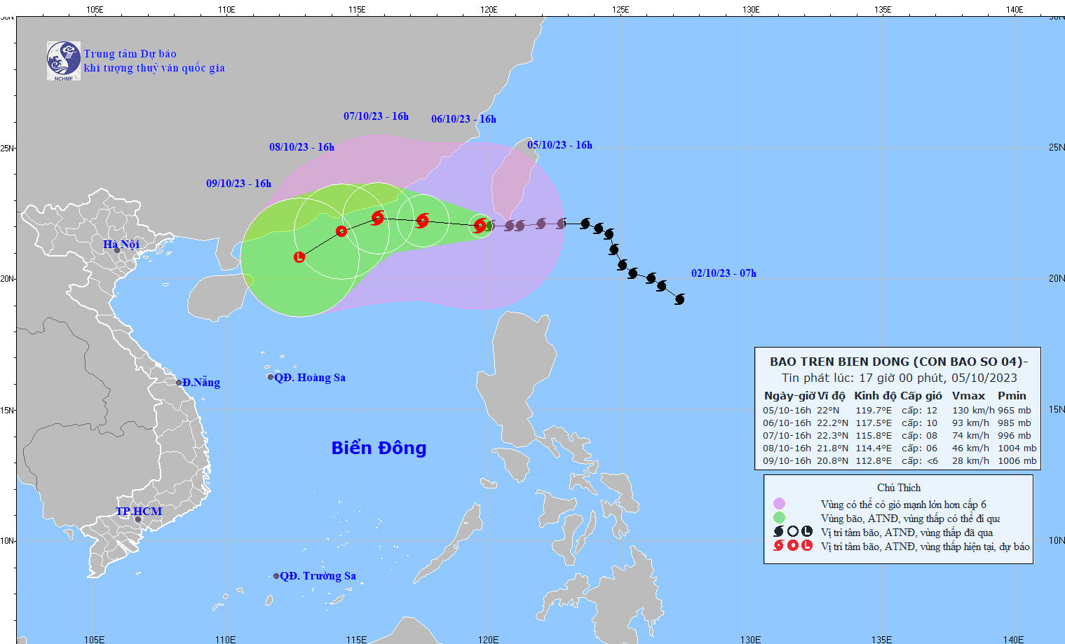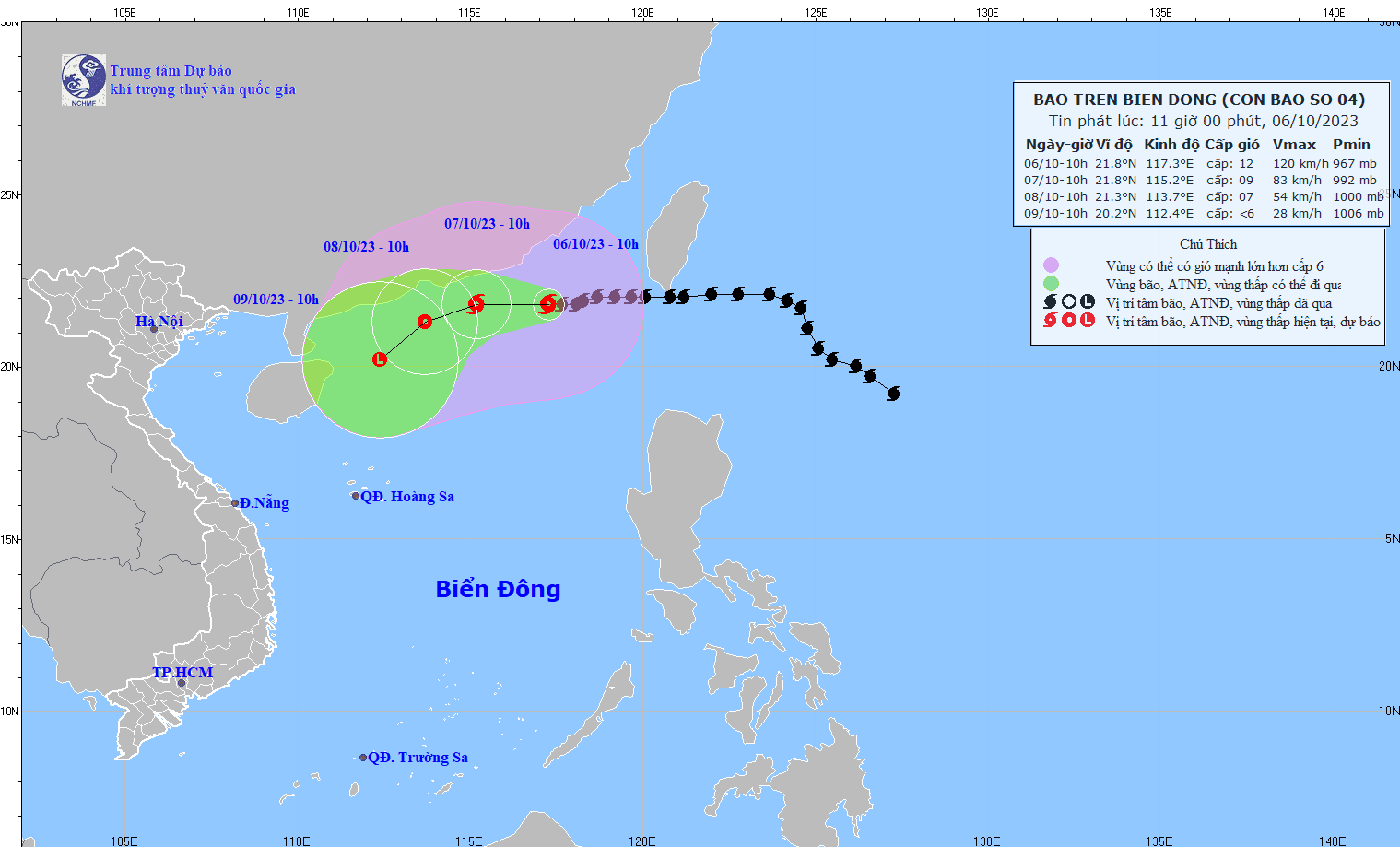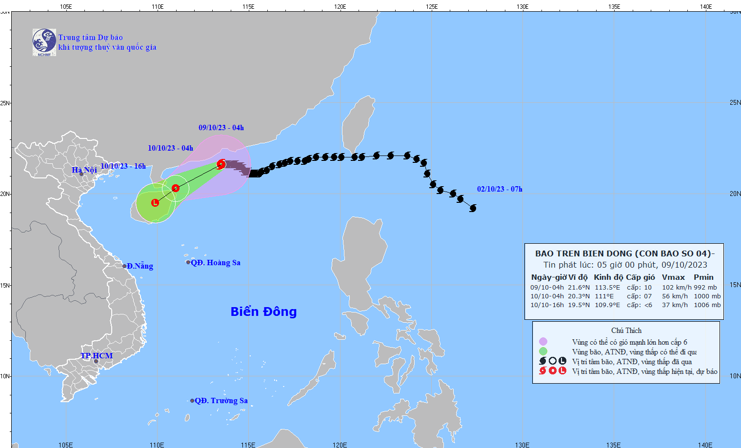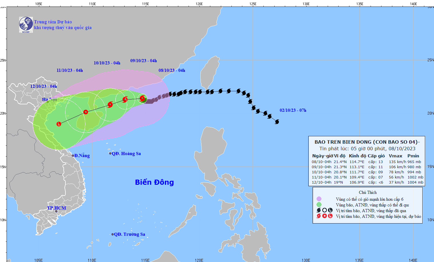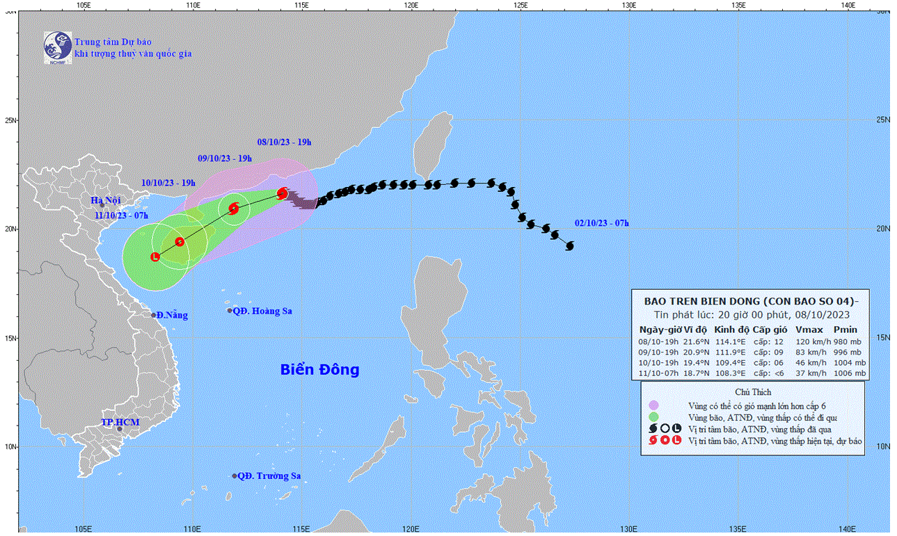- On October 5, 2023, the Standing Office of the National Steering Committee for Natural Disaster Prevention and Control - National Committee for Incident and Disaster Response and Search and Rescue issued Official Telegram No. 12/CD-QG returning 18:00 sent the Steering Committee for Disaster Prevention and Control of coastal provinces and cities from Quang Ninh to Khanh Hoa about proactively responding to storm No. 4.