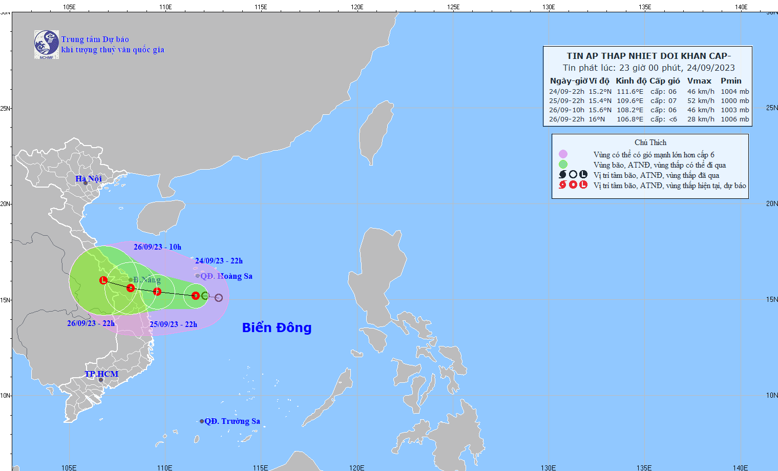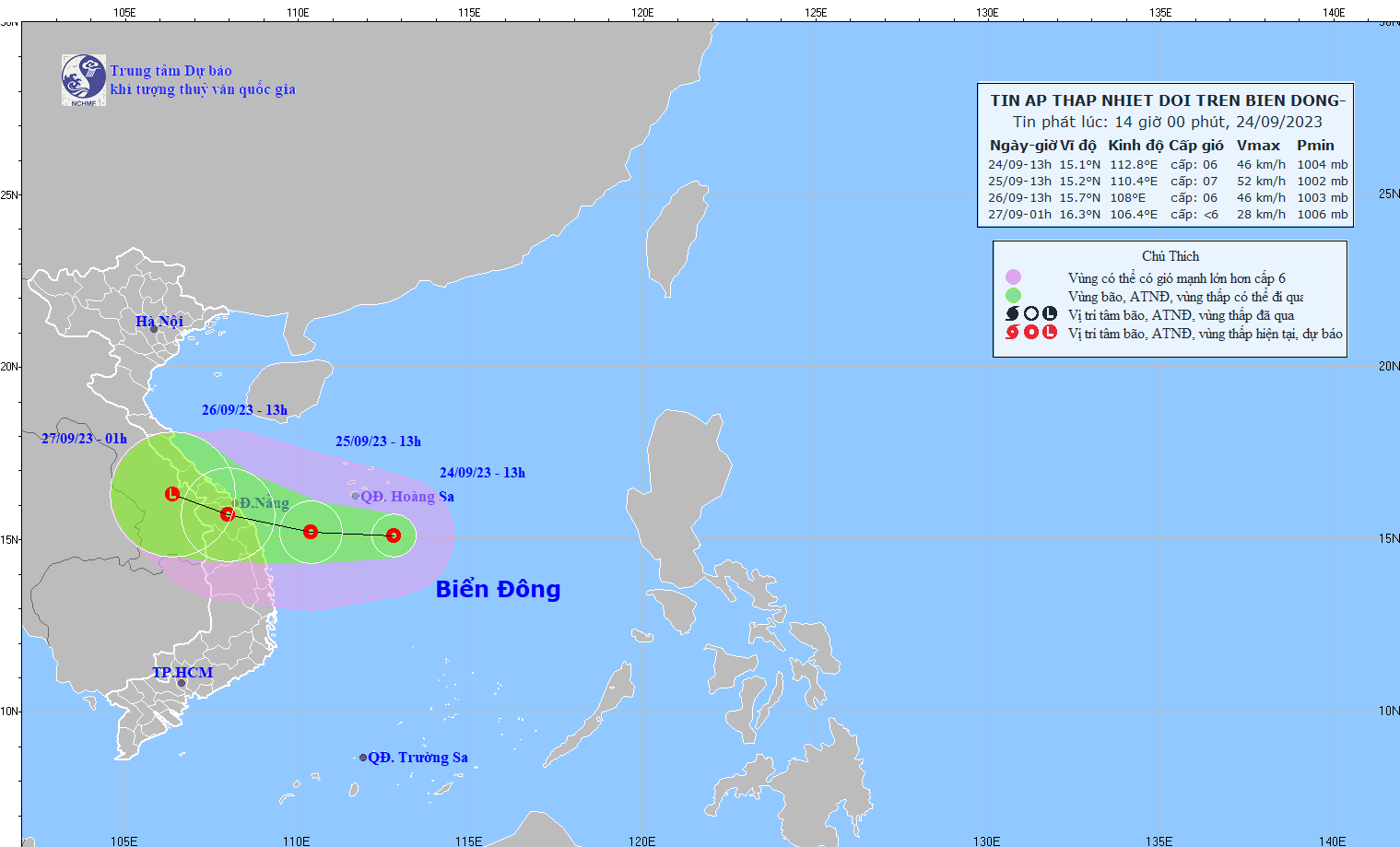 - At 1:00 p.m. on September 24, the location of the tropical depression's center was at about 15.1 degrees North latitude; 112.8 degrees East Longitude, about 200km southeast of Hoang Sa archipelago.