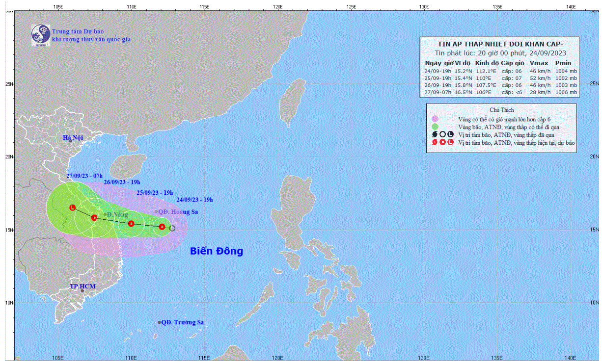 - On the afternoon of September 24, the low pressure area in the southeast sea of the Hoang Sa archipelago strengthened into a tropical depression.