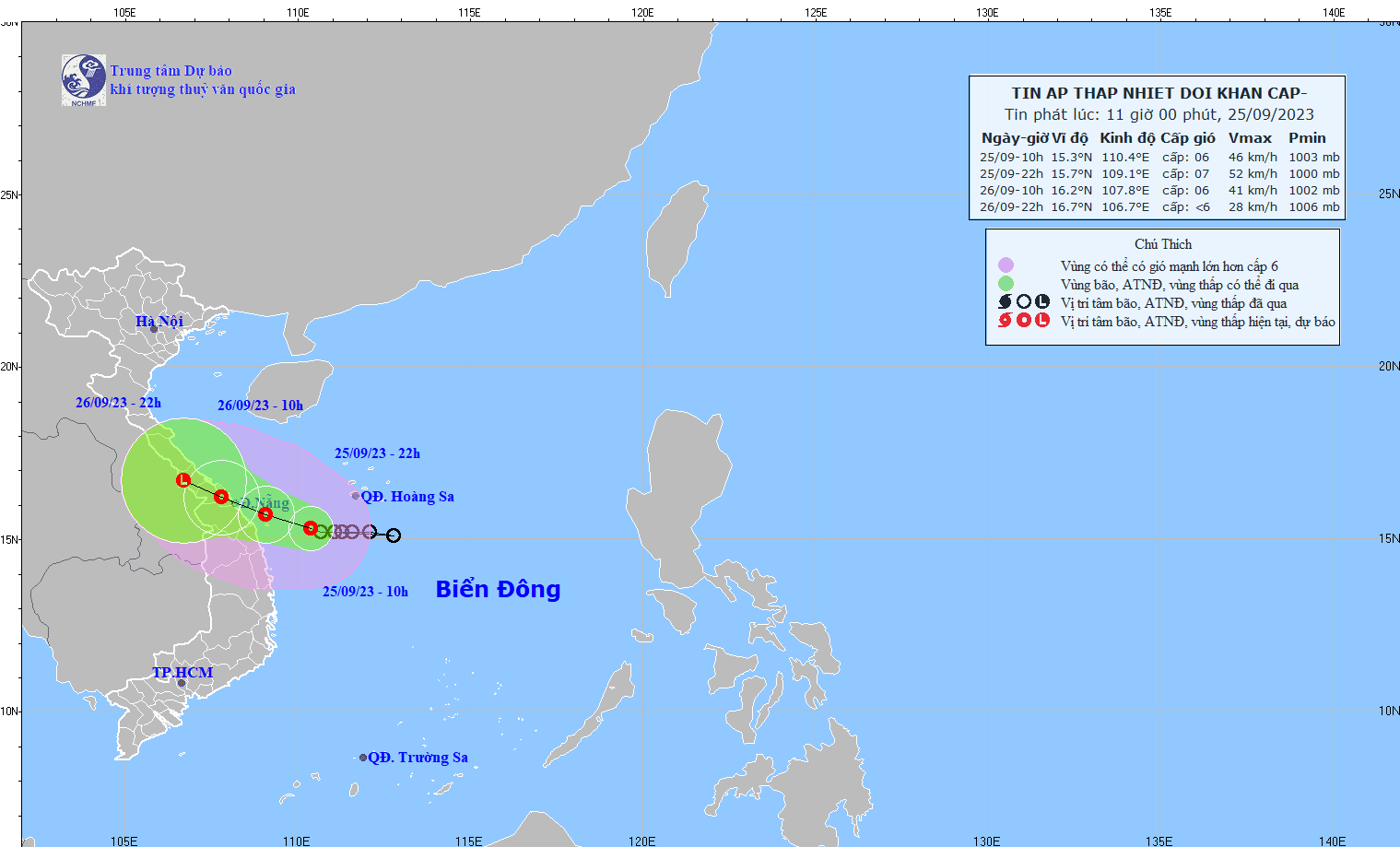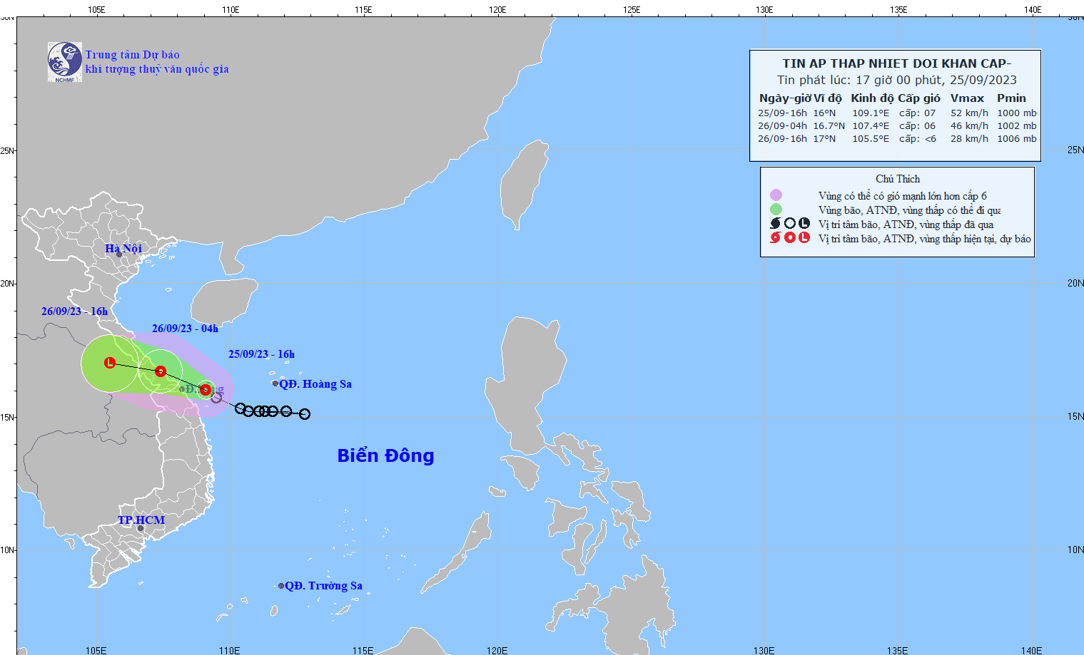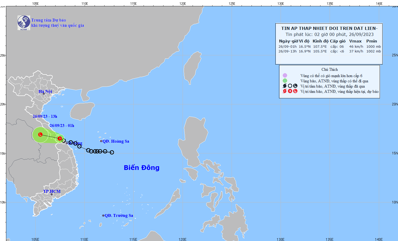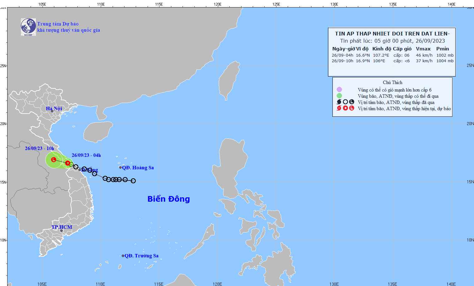 - At 07:00 on September 26, the center of the low pressure area was at about 16.3-17.3 degrees North latitude; 105.9-106.9 degrees East Longitude. The strongest wind in the center of the low pressure area decreased to below level 6 (below 39km/h).