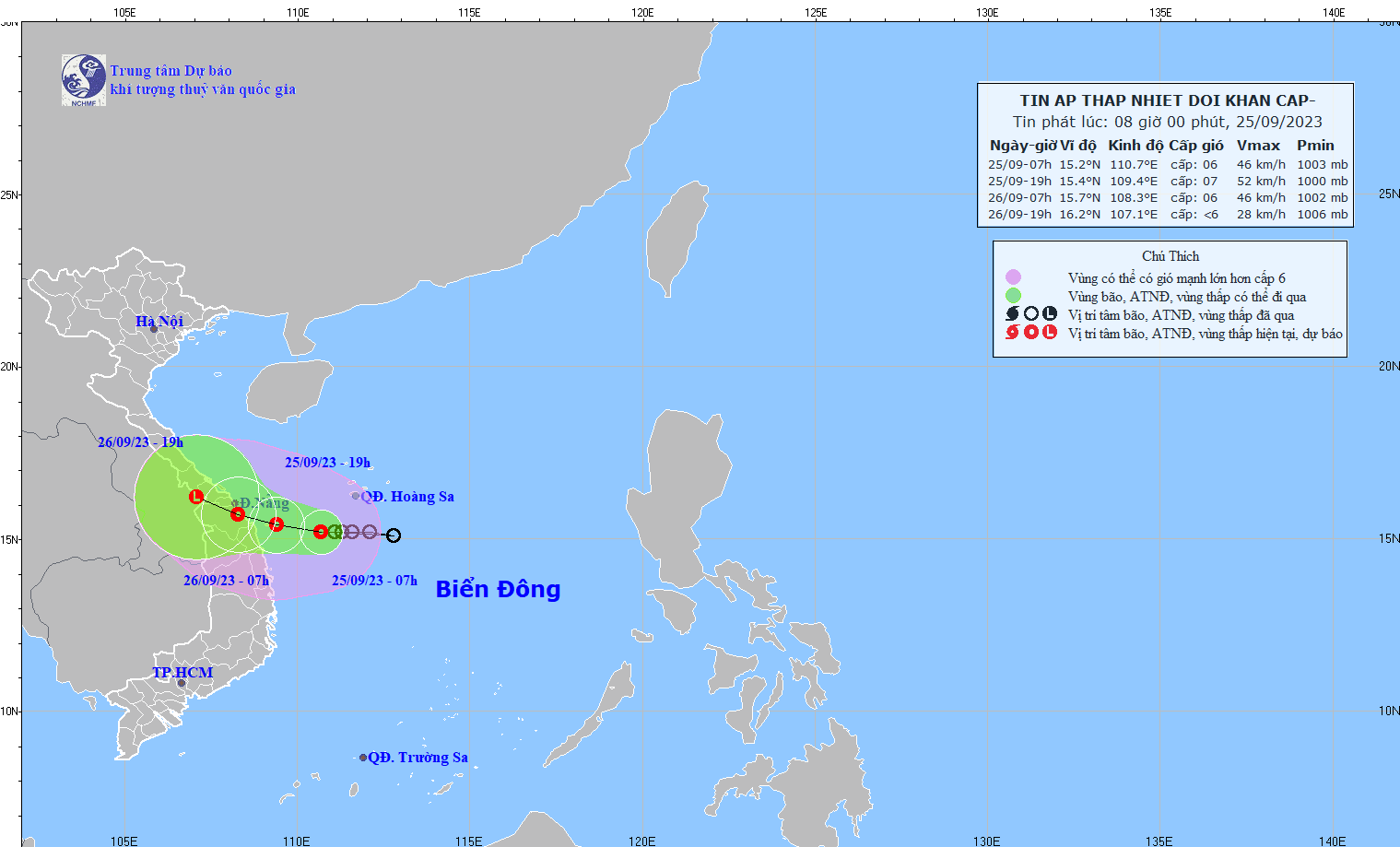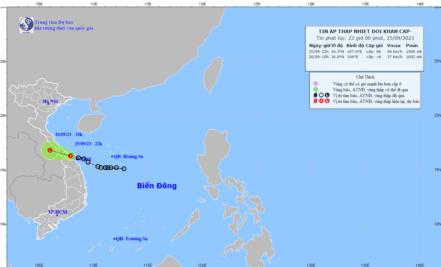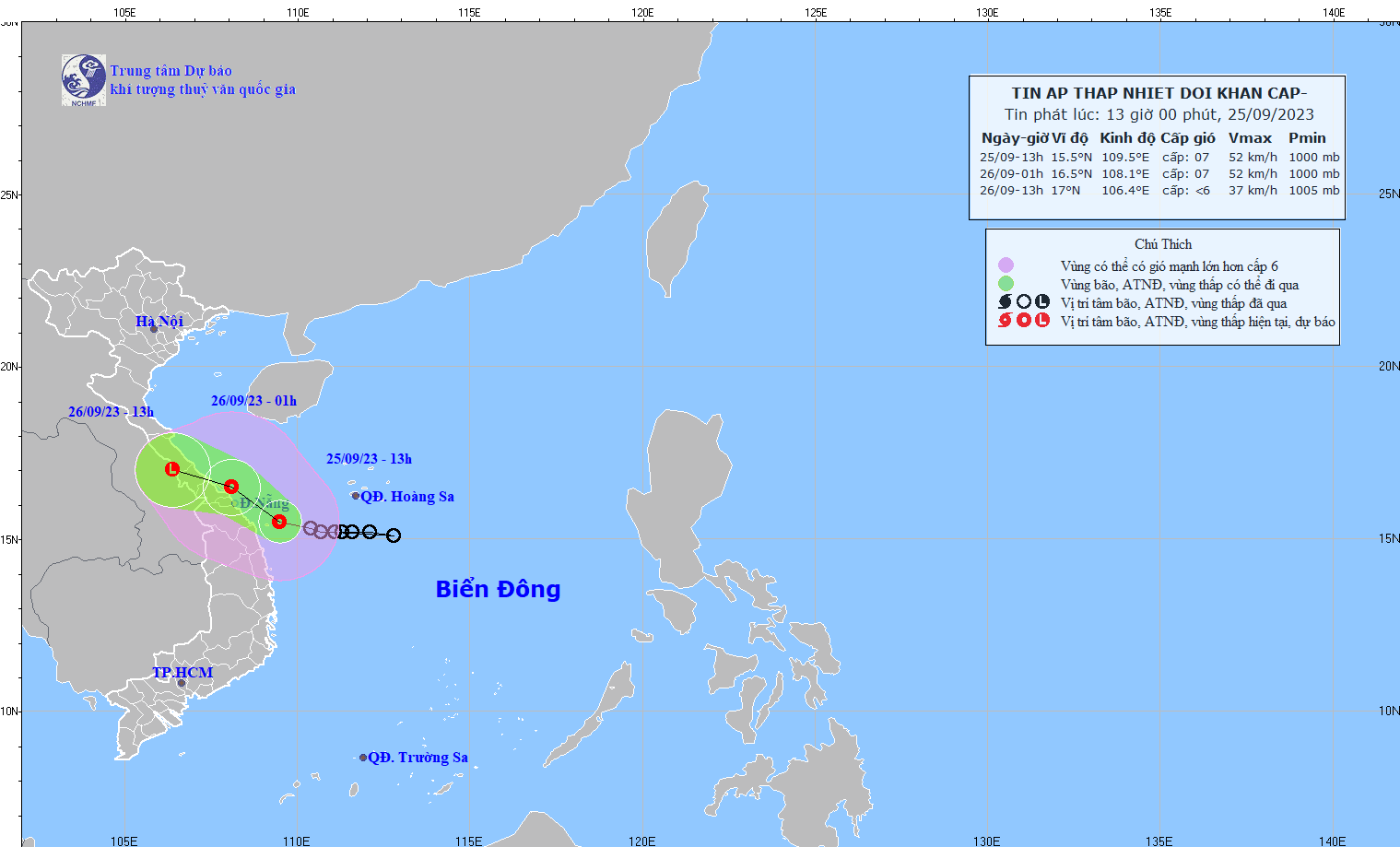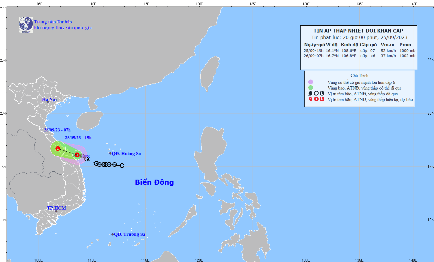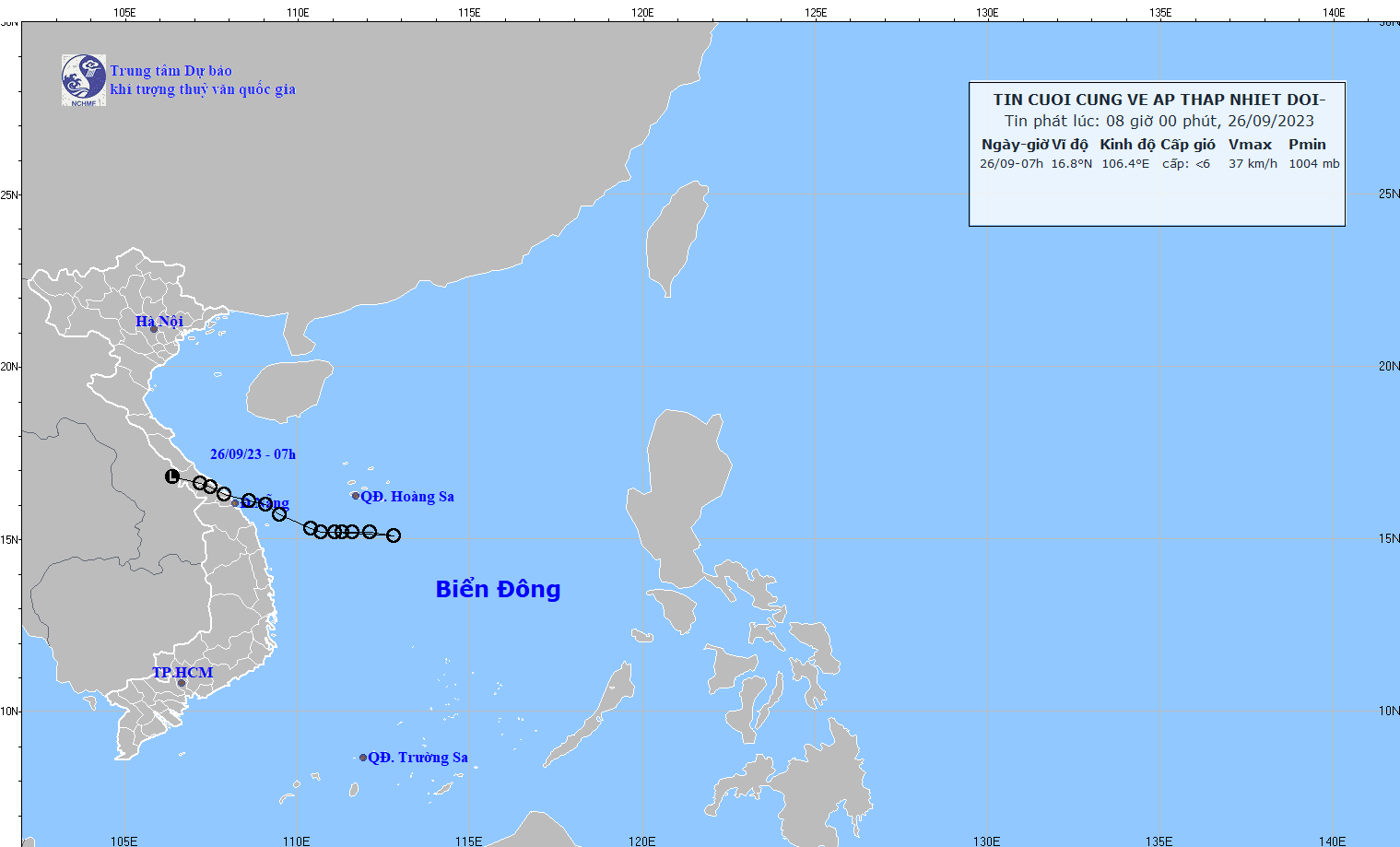 - At 07:00 on September 26, the center of the low pressure area was at about 16.3-17.3 degrees North latitude; 105.9-106.9 degrees East Longitude. The strongest wind in the center of the low pressure area decreased to below level 6 (below 39km/h).