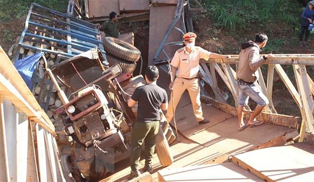 The accident caused Suoi Mum bridge completely damaged; the plow motorcycle was stuck in the middle of the bridge, had a tire explosion and damaged ; Many rubber logs were droped out into the stream.
