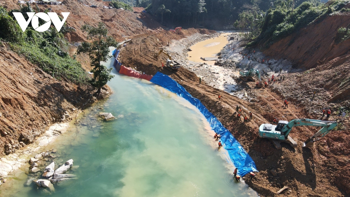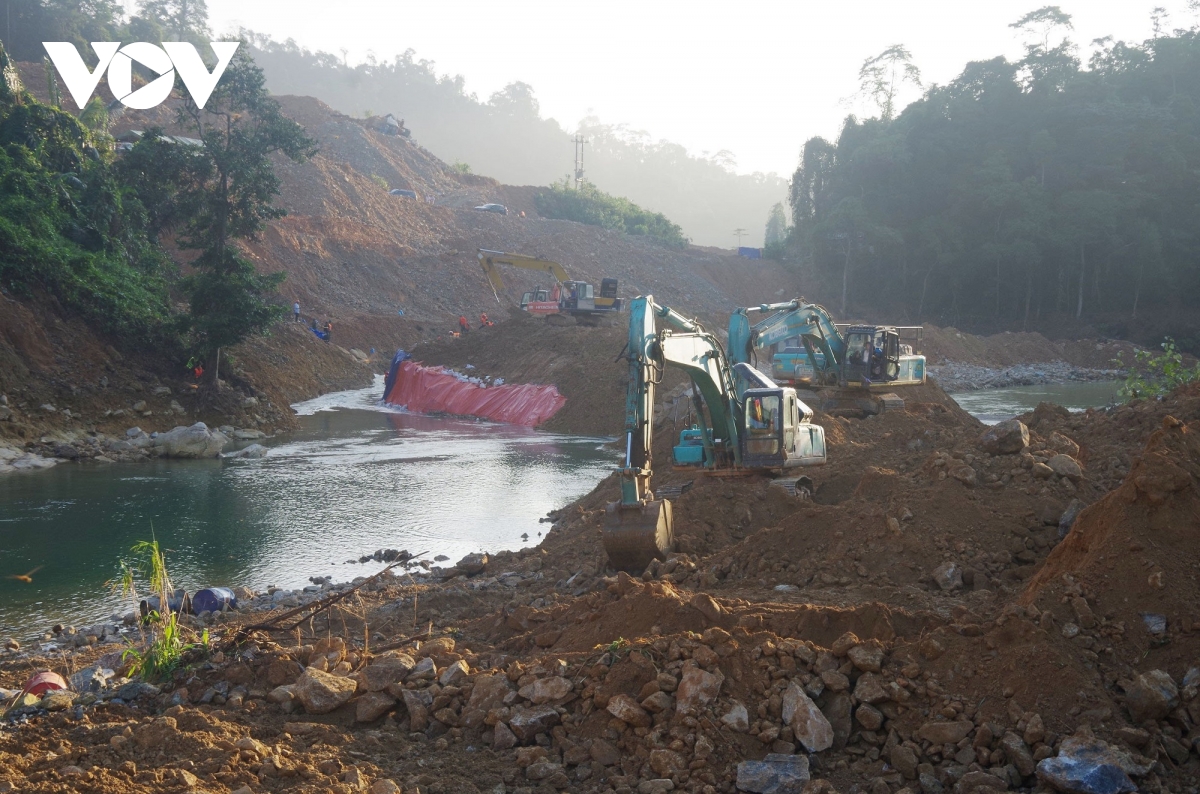 The dam is 3.5 m high, 5 m wide, 15 m long, covered with soil and gabions and canvas located upstream right at the landslide location of Rao Trang 3 hydropower plant. Searching the army, police and dogs of Border Guard Intermediate School began to search the area of the Rao Trang River, where it was suspected that the bodies of 12 hydropower workers Rao Trang 3 were buried. The forces are still actively searching for the remaining missing victims.