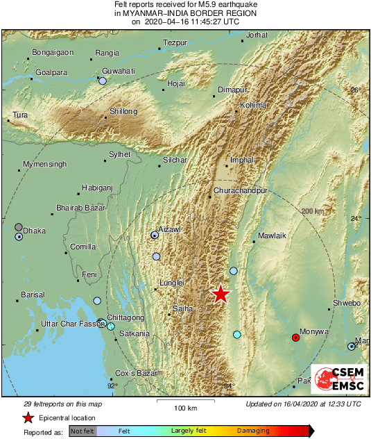 According to EMSC, the earthquake's epicenter is located at a depth of 10km, 35km southeast of Myanmar, 169 km southeast of Aizawl, India.