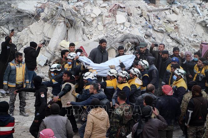 Rescuers move victims' bodies at the site of the earthquake after an earthquake in the town of Jindayris, Aleppo province, Syria, February 10, 2023 (Photo: AFP/VNA)