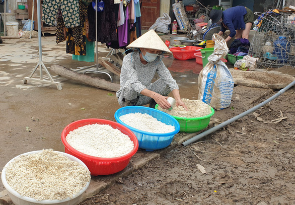 Carrying four baskets of wet rice, which smelled sour because of long soaking in the flood, and brought it to the yard to dry, Mrs. Le Thi Trung (54 years old) told this morning.