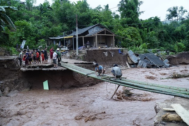The people of Nam Po district (Dien Bien) built a temporary bridge to go after being swept away by floodwaters. (Photo: Xuan Tu / VNA)