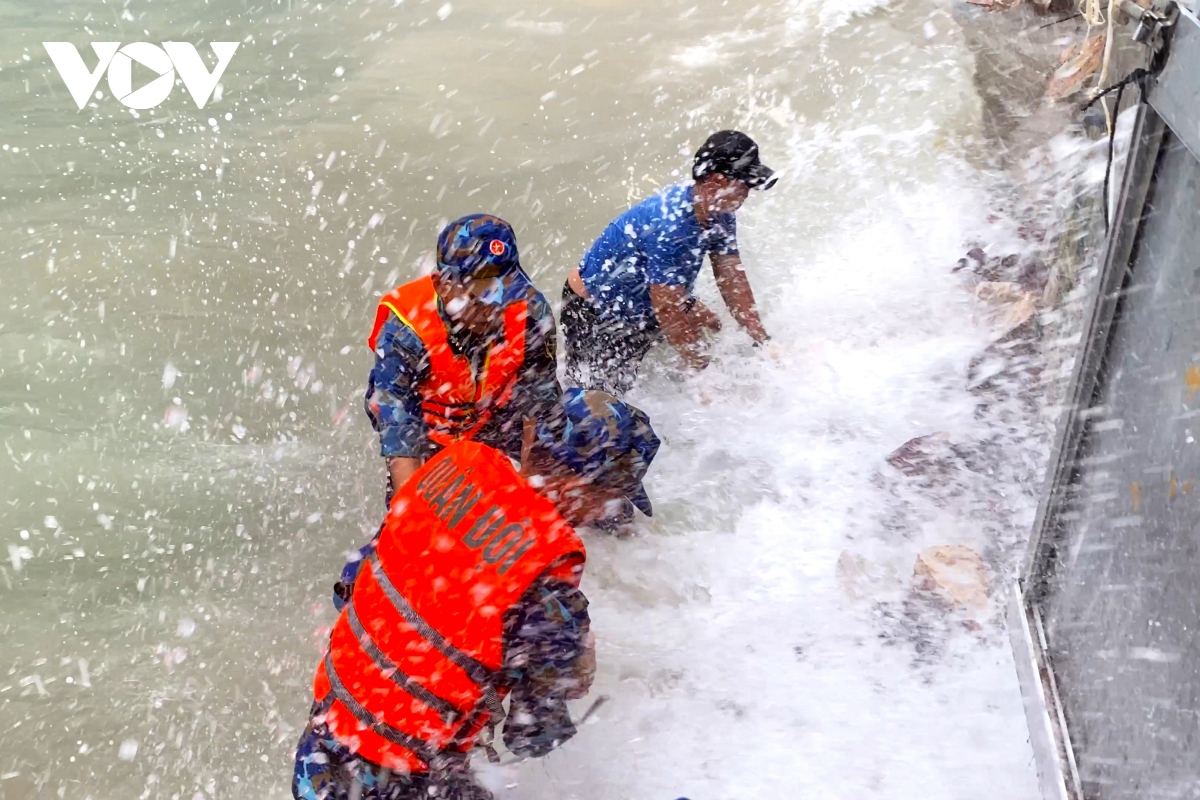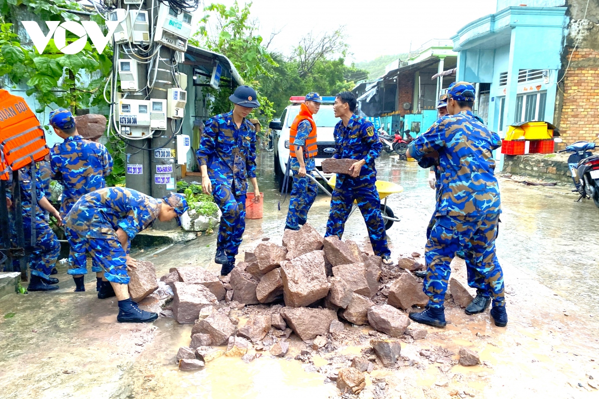 Faced with the above situation, on the morning of September 4, the Party Committee and local government asked the Naval Region 5 Command to support the implementation of emergency landslide prevention and control plans. Region 5 Navy has mobilized nearly 50 officers and soldiers to quickly come to the scene to coordinate with on-site forces to organize the removal of people's assets from the landslide area, while at the same time securing their houses and transporting them to the area. Moved dozens of blocks of rubble to shore embankment. With a spirit of urgency and positivity, officers and soldiers of the Navy Region 5 and other forces were immersed in cold rain and heavy waves for many hours continuously to embank the coastal areas that were subsided, landslides, and damaged. to invade deep into residential areas.