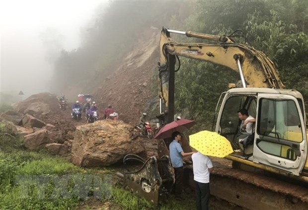 Lai Chau functional departments mobilize vehicles, machines, and human resources to overcome landslides. (Photo: Viet Hoang / VNA)
