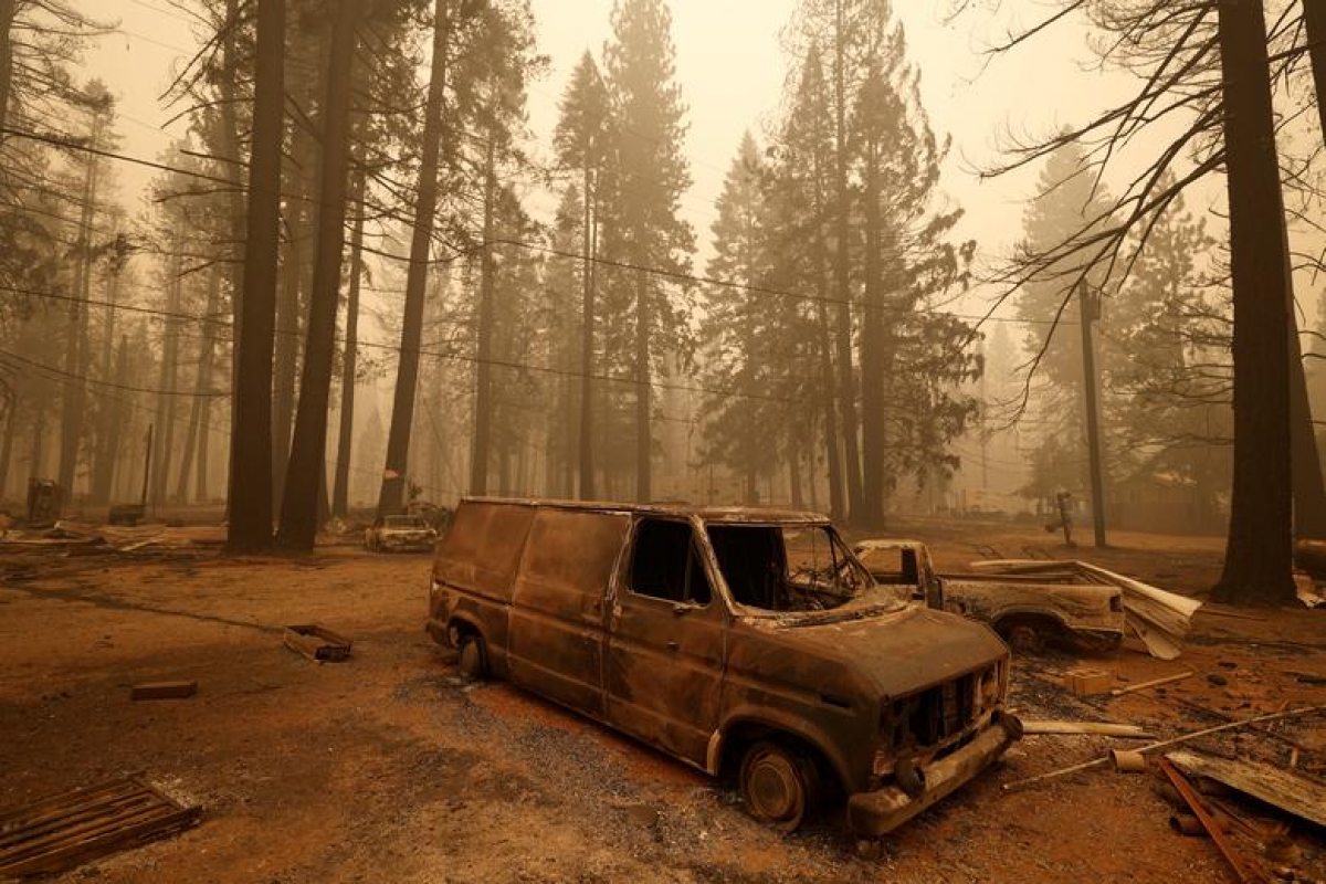 A burned-out car after the Dixie wildfire near the town of Canyondam, California, August 7, 2021
