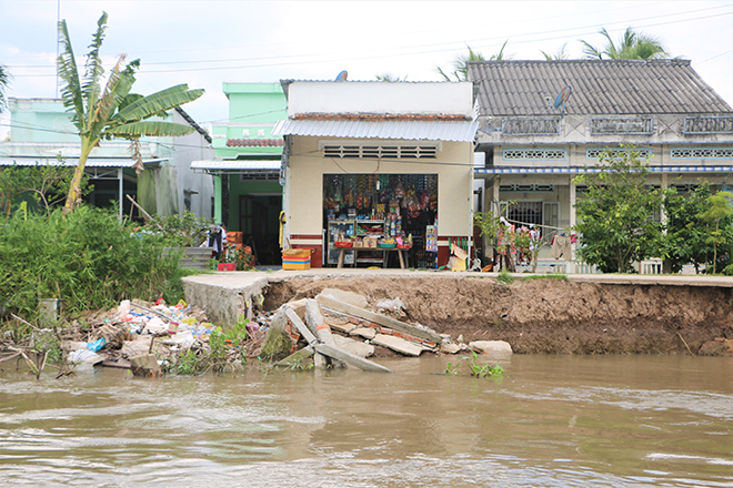 Mr. Le Hoang Phong, Standing Vice Chairman of the People's Committee of Ke Sach District, said that the situation of landslides on riverbanks, canals, roads and houses in the district is happening more and more, especially when there are strong impacts. of storms, floods and high tides. Landslides damage infrastructure works, areas of houses on stilts along river banks, loss of land, affecting people's lives.