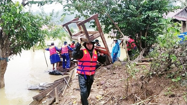 Border guard forces, teachers and people in Truong Son commune, Quang Ninh district, Quang Binh moved tables, chairs and teaching materials to a dry place. (Photo: Vo Dung / VNA)
