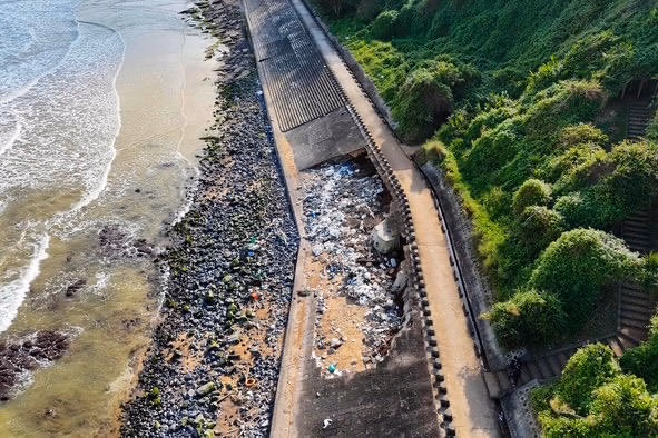 Mr. Phan Truong Dinh, Head of the Vinh Moc Tunnels Management Board, stated that the damage was caused by Typhoon No. 10 in 2025. During the storm, massive waves repeatedly battered the embankment, destroying several structural components. He warned that if the erosion continues to spread, the road above faces a total collapse, potentially threatening the integrity of the historical site.