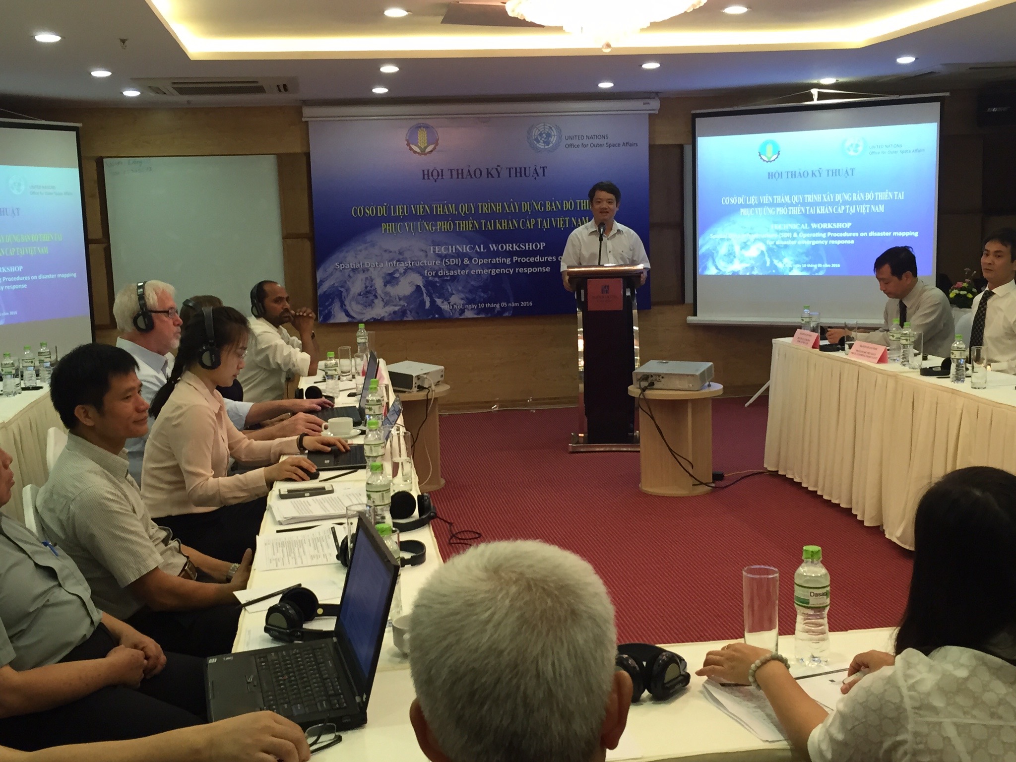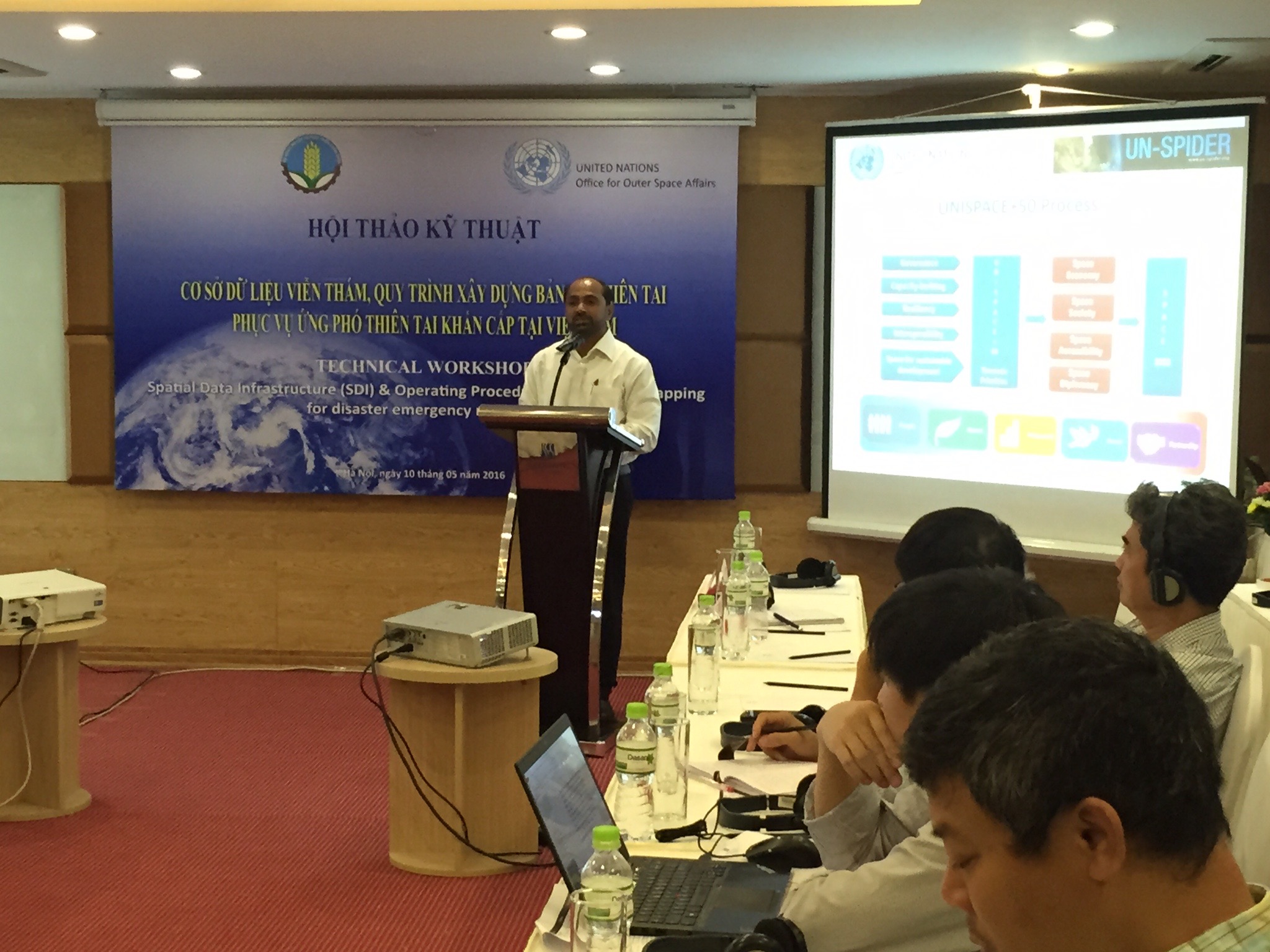 Opening the workshop, The Deputy General Director of Water Resources Directorate affirms that the important role of technology, especially geospatial technology and currently it is being concerned, promotive support to disaster prevention in Viet Nam. Mr Shirish Ravan, Head of UN-SPIDER in Asia also emphasizes the role of spatial technology in supporting implement the objectives in Sendai Framework for disaster risk reduction 2015-2030.