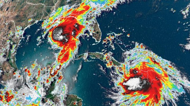 Satellite images of storms Marco and Laura. (Source: CNN)