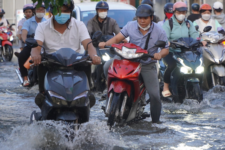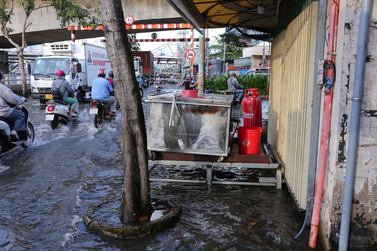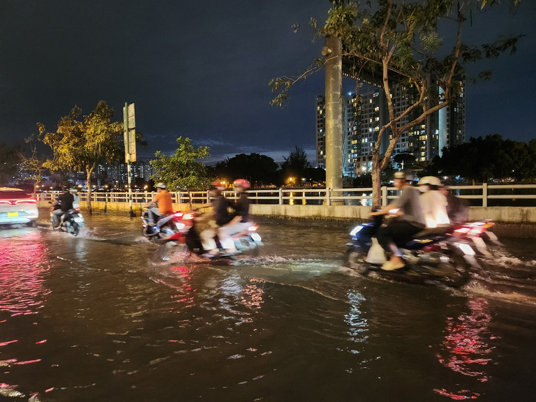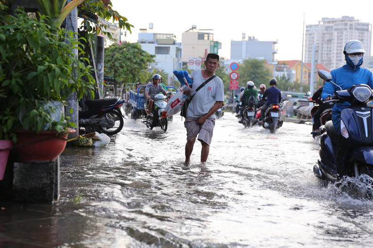 Tran Xuan Soan Street (District 7) is the road that is most frequently flooded during high tides. The flooding started at 4:30 p.m. but by 7:30 p.m., the water had not yet receded.