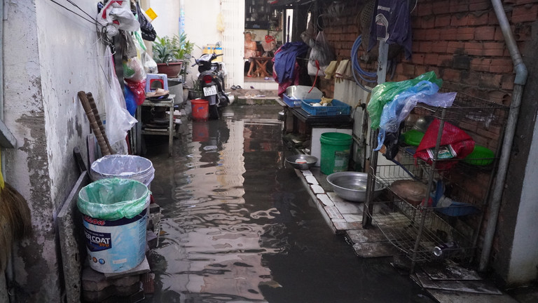 Every time a car passes by, water waves flood into the house. "This area often experiences flooding. "The water often rises a lot at night, this alley has been flooded for about half a month now," said Ms. Nguyen Thi Thanh Van (81 years old, District 7, Ho Chi Minh City)