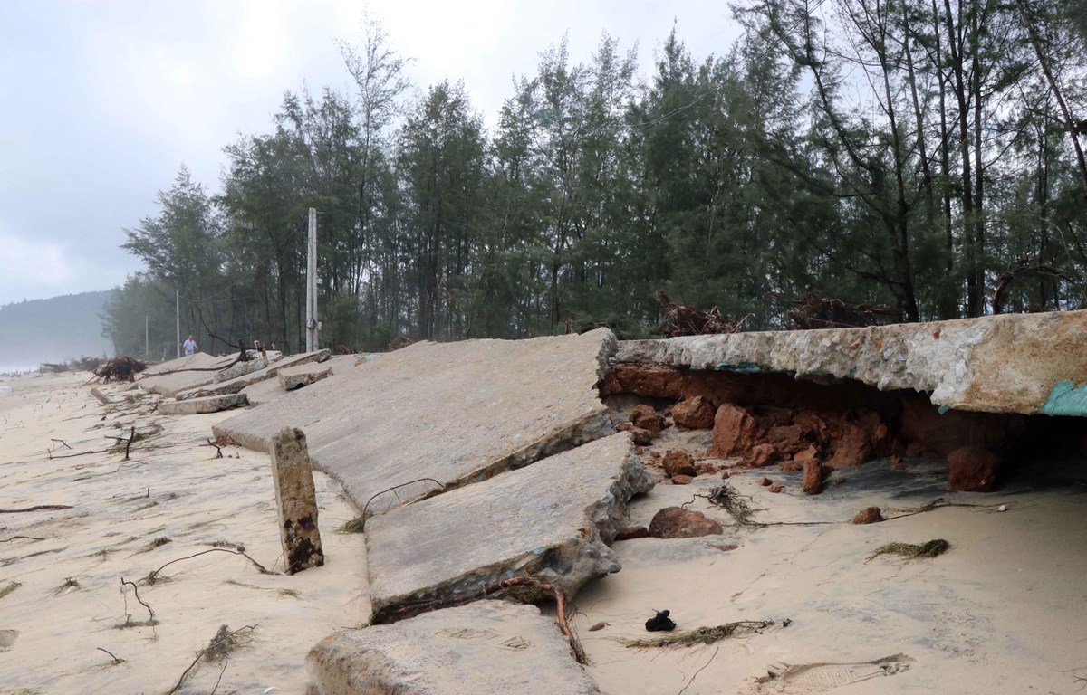 The waves washed away a lot of protection forests and destroyed the coastal route of Provincial Highway 21, passing through Giang Hai commune, Phu Loc district.