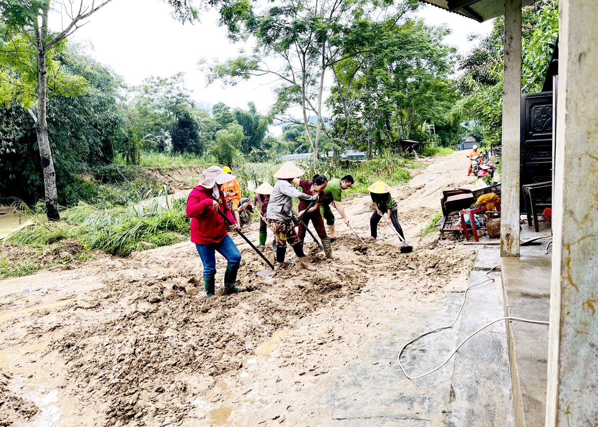 With the motto "4 on-site", urgently saving people, saving property, helping people stabilize their lives, localities have proactively mobilized forces and means to support people in moving property, repairing houses, cleaning up mud after floods, and harvesting crops. In Ha Giang city, with 39 flooded areas, thousands of households had water entering their houses. Right on the afternoon of June 10, when the water began to recede, people actively cleaned their houses, collected garbage, cleaned up mud and soil on the streets, and supported the repair of flooded vehicles. Chairman of Phuong Thien Commune People's Committee, Le Thai Hung said: "Phuong Thien Commune has a 600m long flooded road, both sides of the road are buried in mud about 5 - 10cm deep, making it difficult for vehicles to travel. From early morning on June 11, when the water receded, the commune mobilized human resources to actively dredge mud, clear ditches, and is expected to clean the entire road by the afternoon of the same day, ensuring convenient travel for people and vehicles."